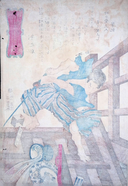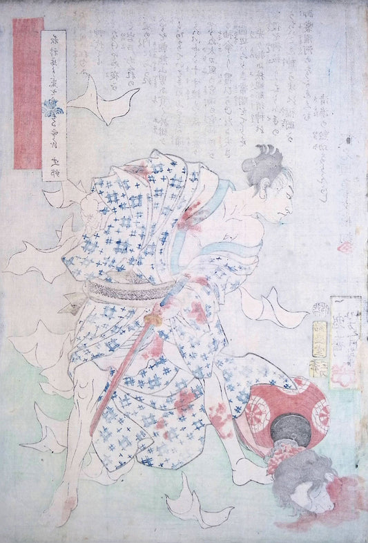 Tsukioka Yoshitoshi (1839 – 1892) is widely recognized as the last great master of ukiyo-e. He was an amazing artist and his design style was much more realistic than other Japanese artists. Yoshitoshi struggled with mental issues and much of that struggle came out in his work of violent themes. He is also well known for the beauty and creativity of his series "100 Aspects of the Moon", and his imaginative "New Forms of 36 Ghosts".