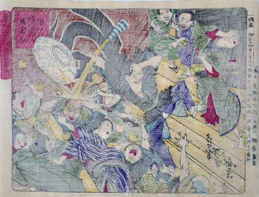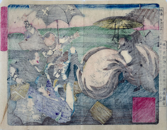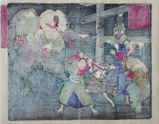 Tsukioka Yoshitoshi (1839 – 1892) is widely recognized as the last great master of ukiyo-e. He was an amazing artist and his design style was much more realistic than other Japanese artists. Yoshitoshi struggled with mental issues and much of that struggle came out in his work of violent themes. He is also well known for the beauty and creativity of his series "100 Aspects of the Moon", and his imaginative "New Forms of 36 Ghosts".