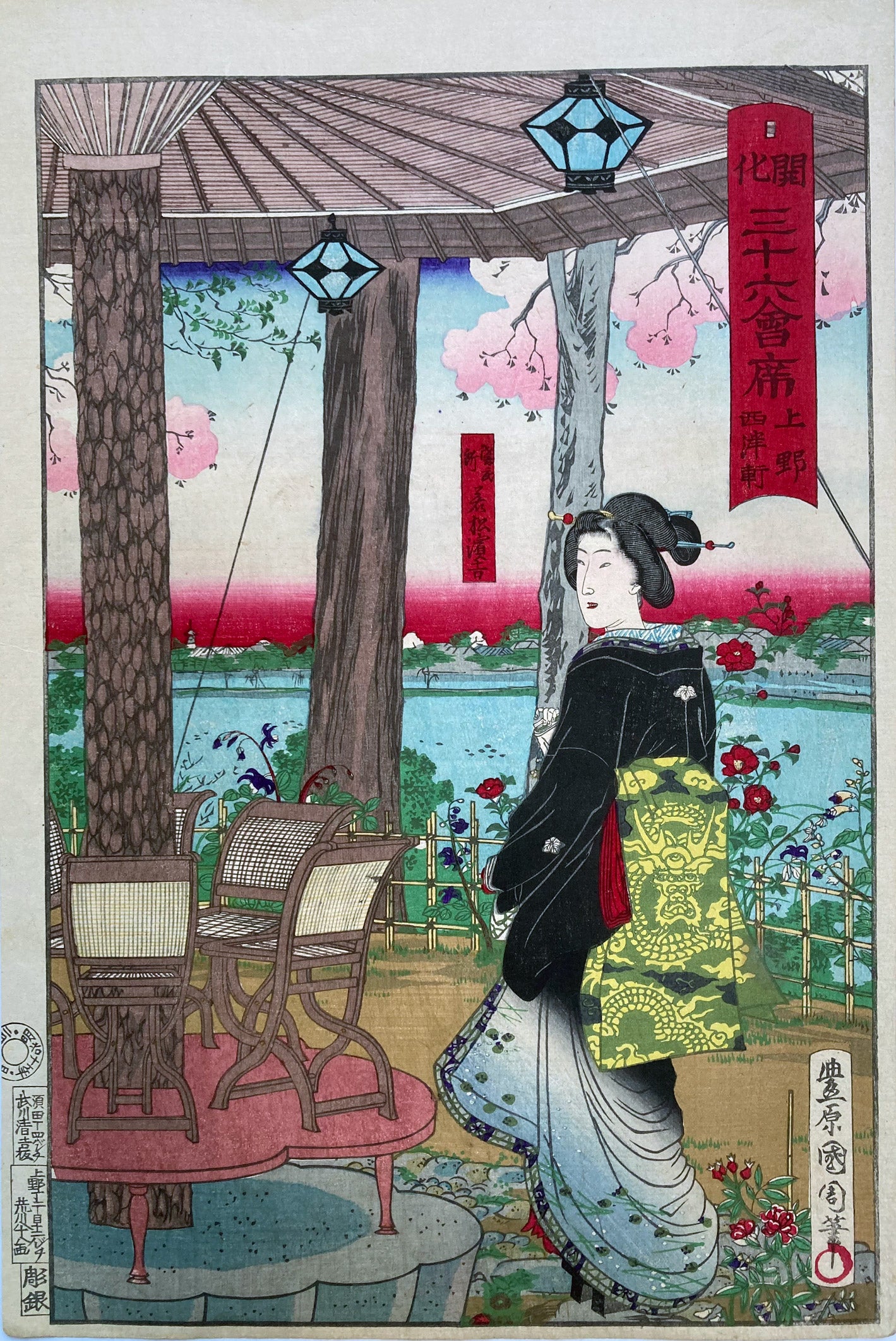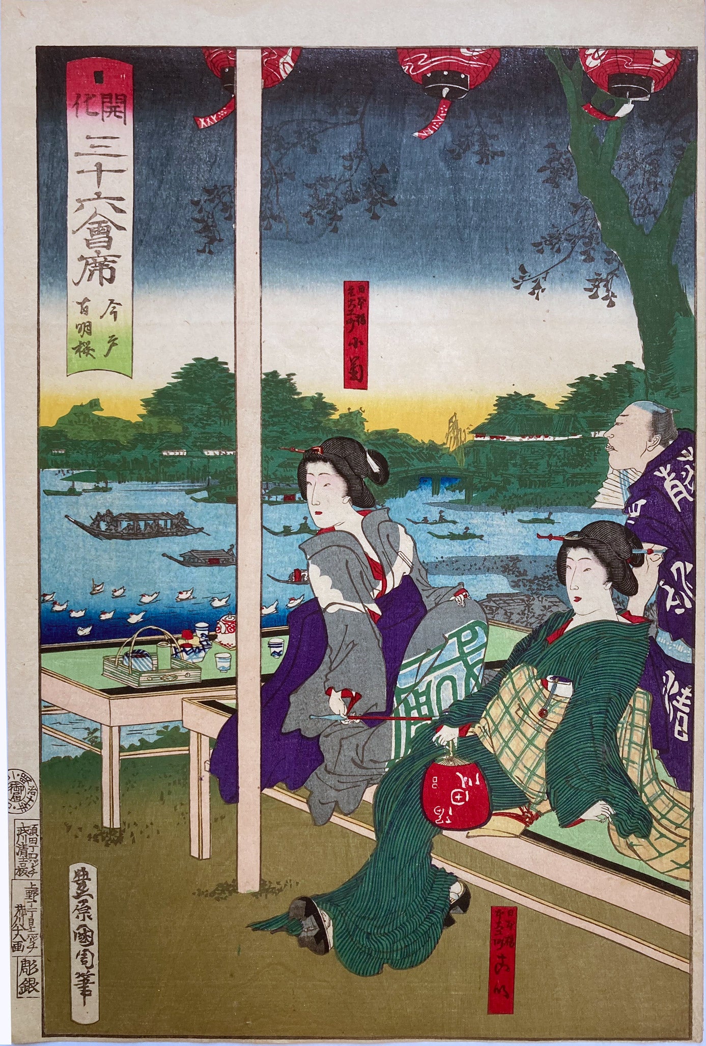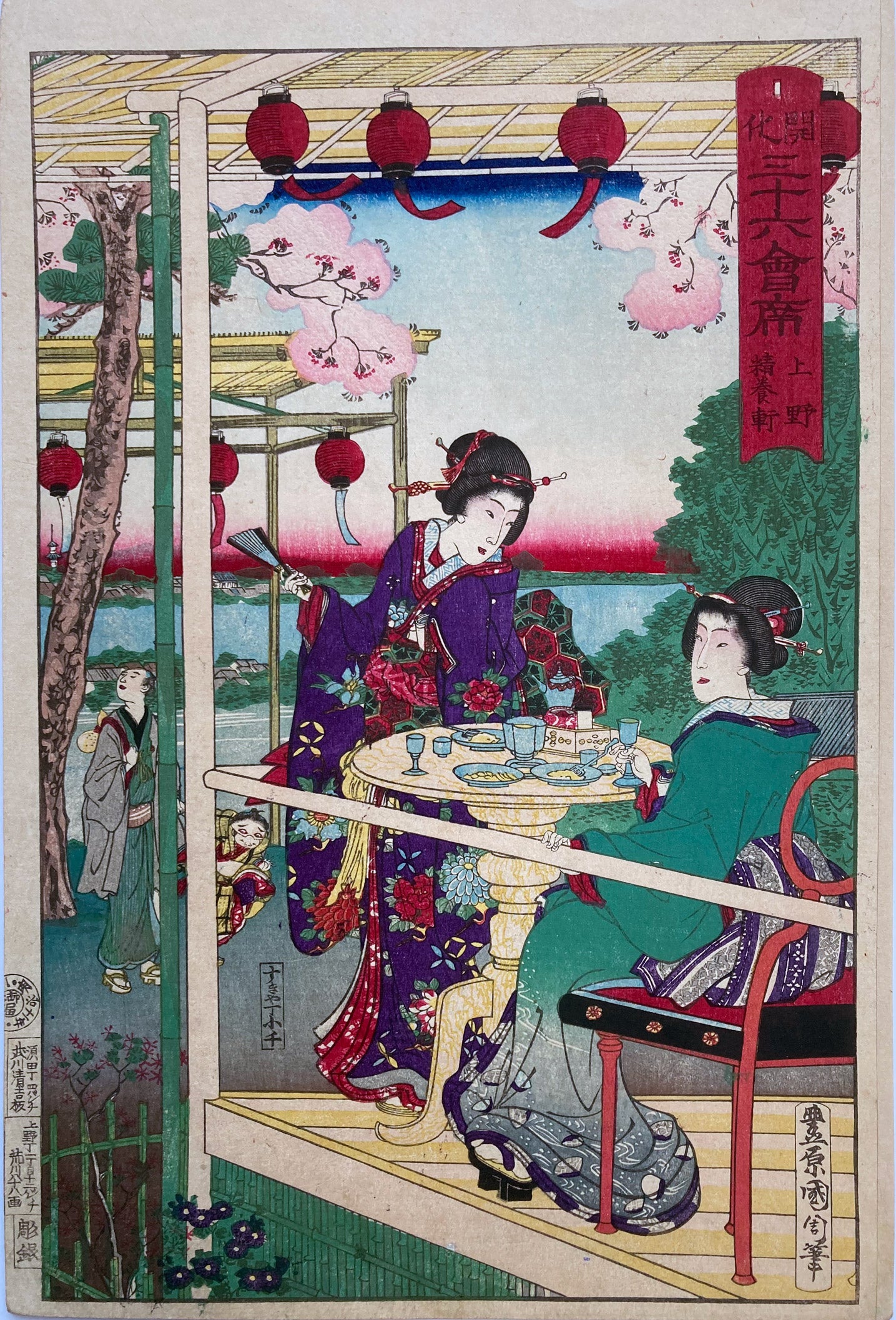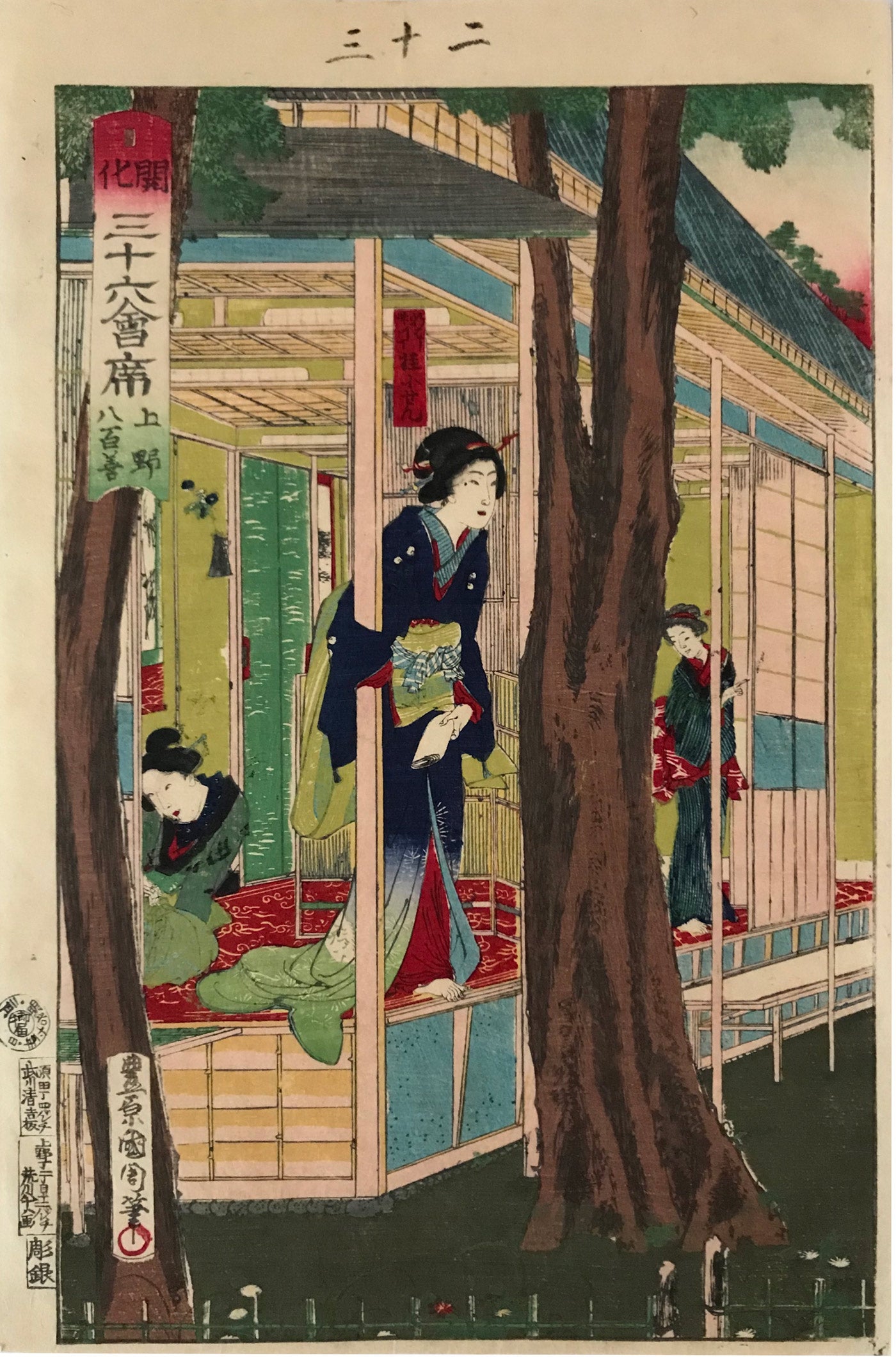 This complete series, published in 1877-1878, demonstrates the commercial ties between businesses, in this case restaurants, and popular artists of the day. Kunichika portrays thirty-six of the most popular restaurants in Japan (actually 37). These prints focus on the interior and exterior architecture, views from the restaurant, attractive customers and restaurant staff, we seldom see actual food. The designs are bold, colorful and provide a snapshot of the fine restaurants and habits of the time.