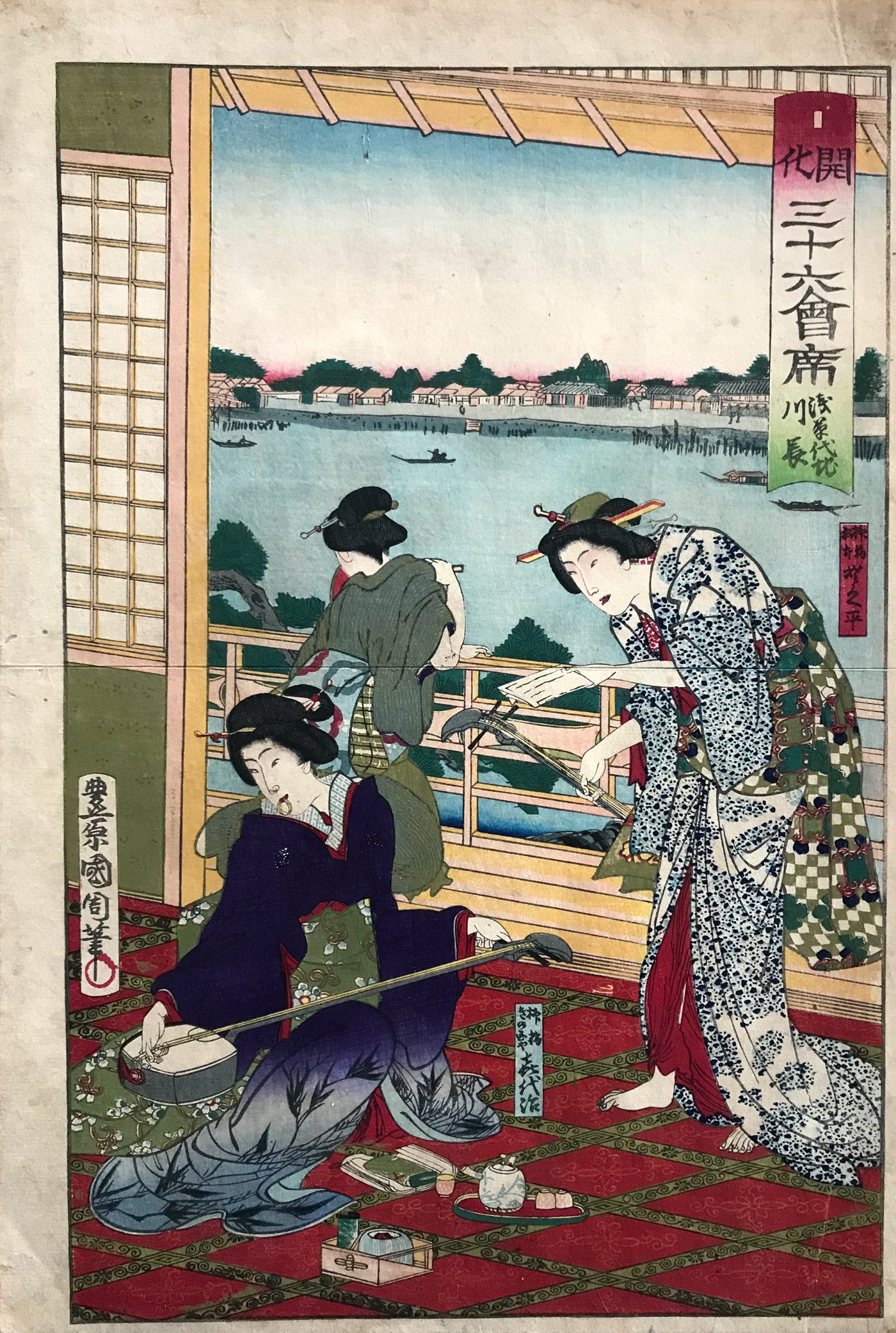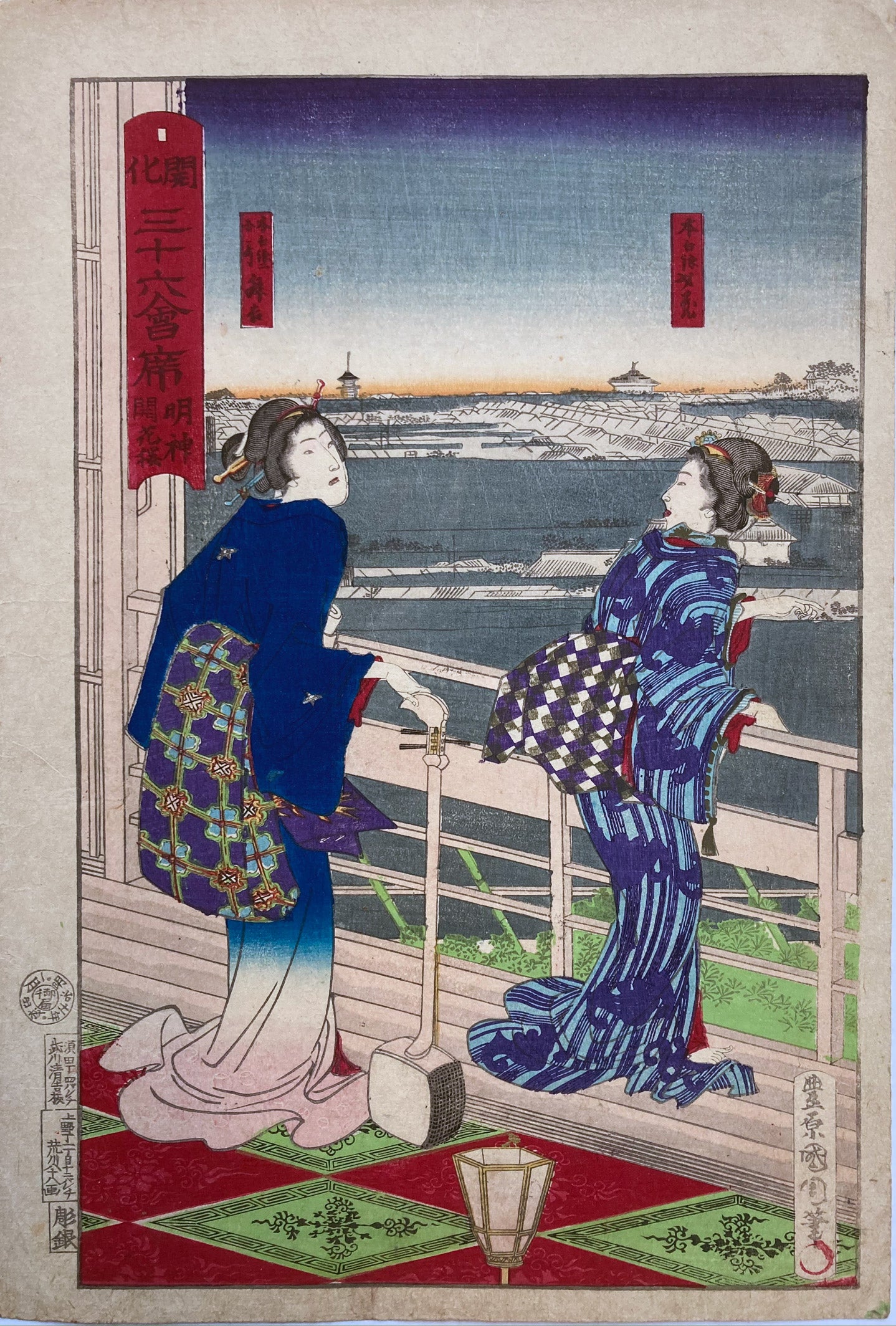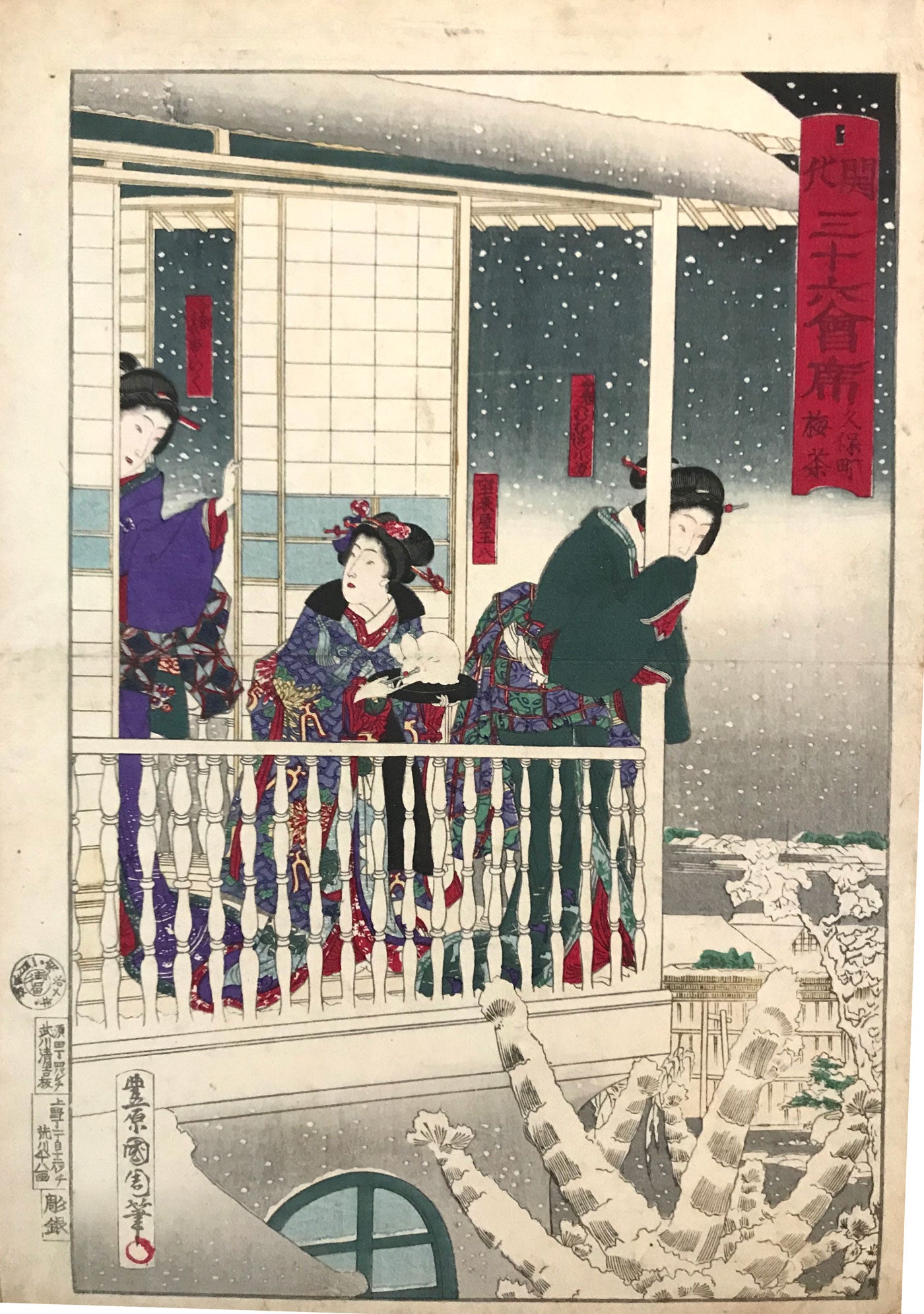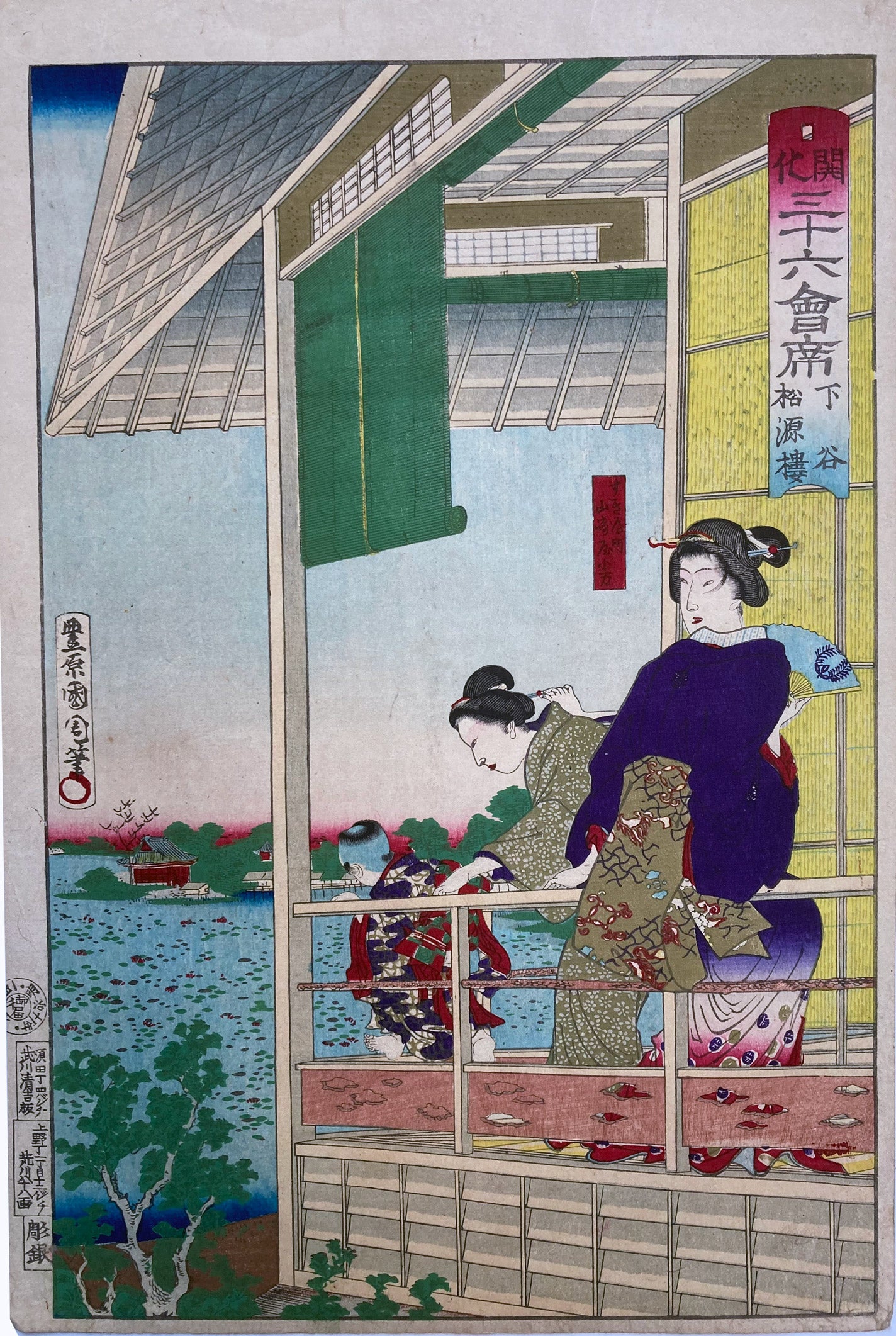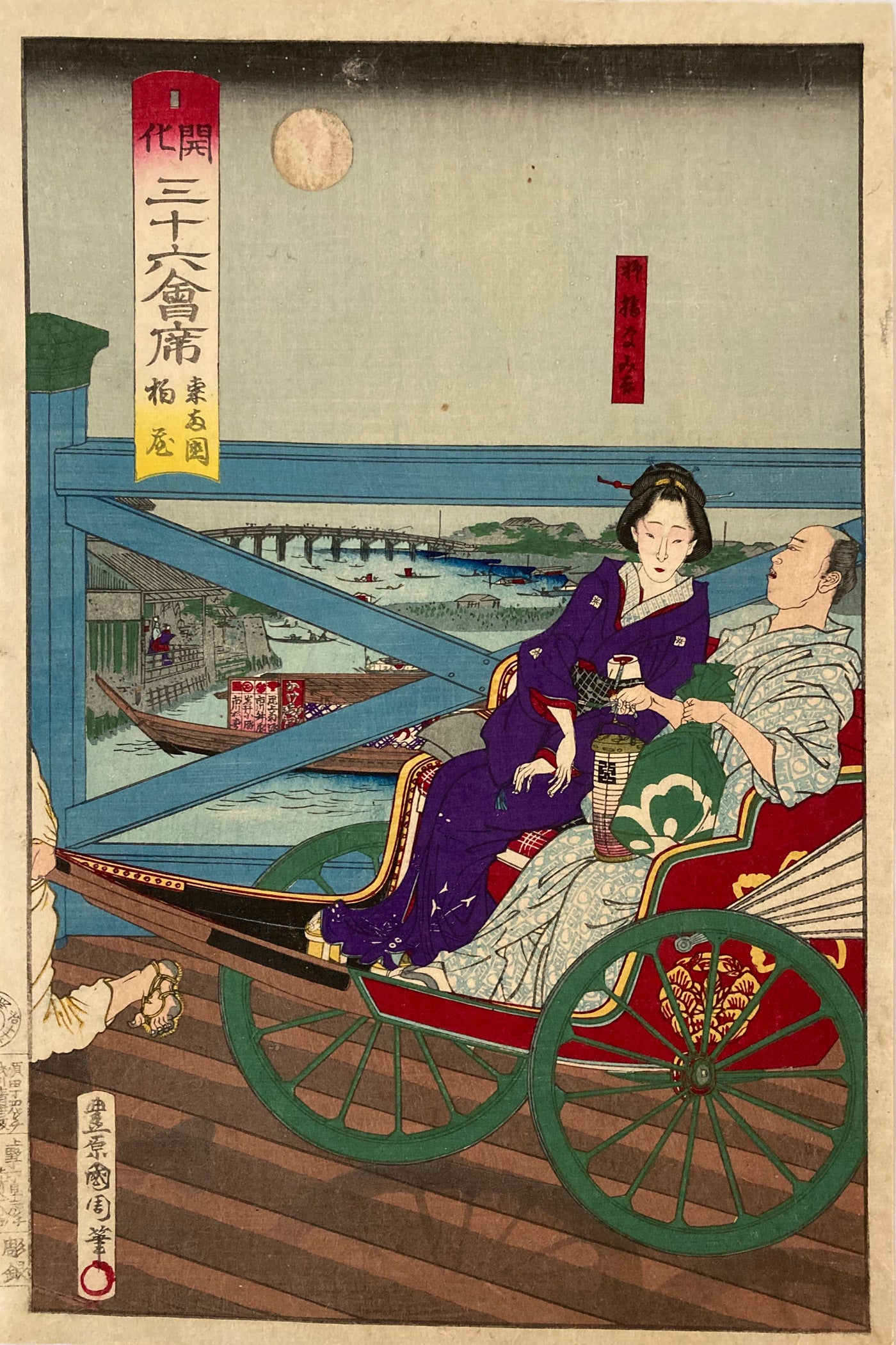 This complete series, published in 1877-1878, demonstrates the commercial ties between businesses, in this case restaurants, and popular artists of the day. Kunichika portrays thirty-six of the most popular restaurants in Japan (actually 37). These prints focus on the interior and exterior architecture, views from the restaurant, attractive customers and restaurant staff, we seldom see actual food. The designs are bold, colorful and provide a snapshot of the fine restaurants and habits of the time.