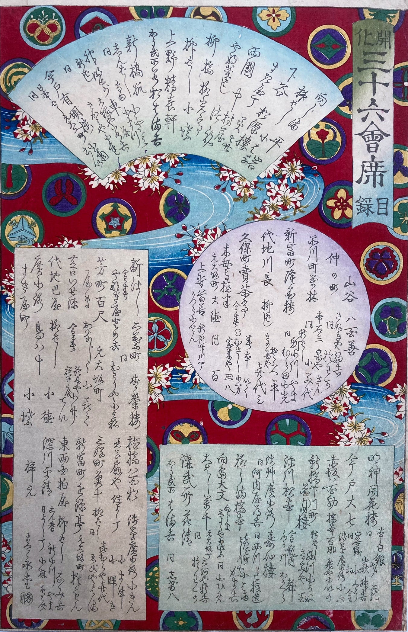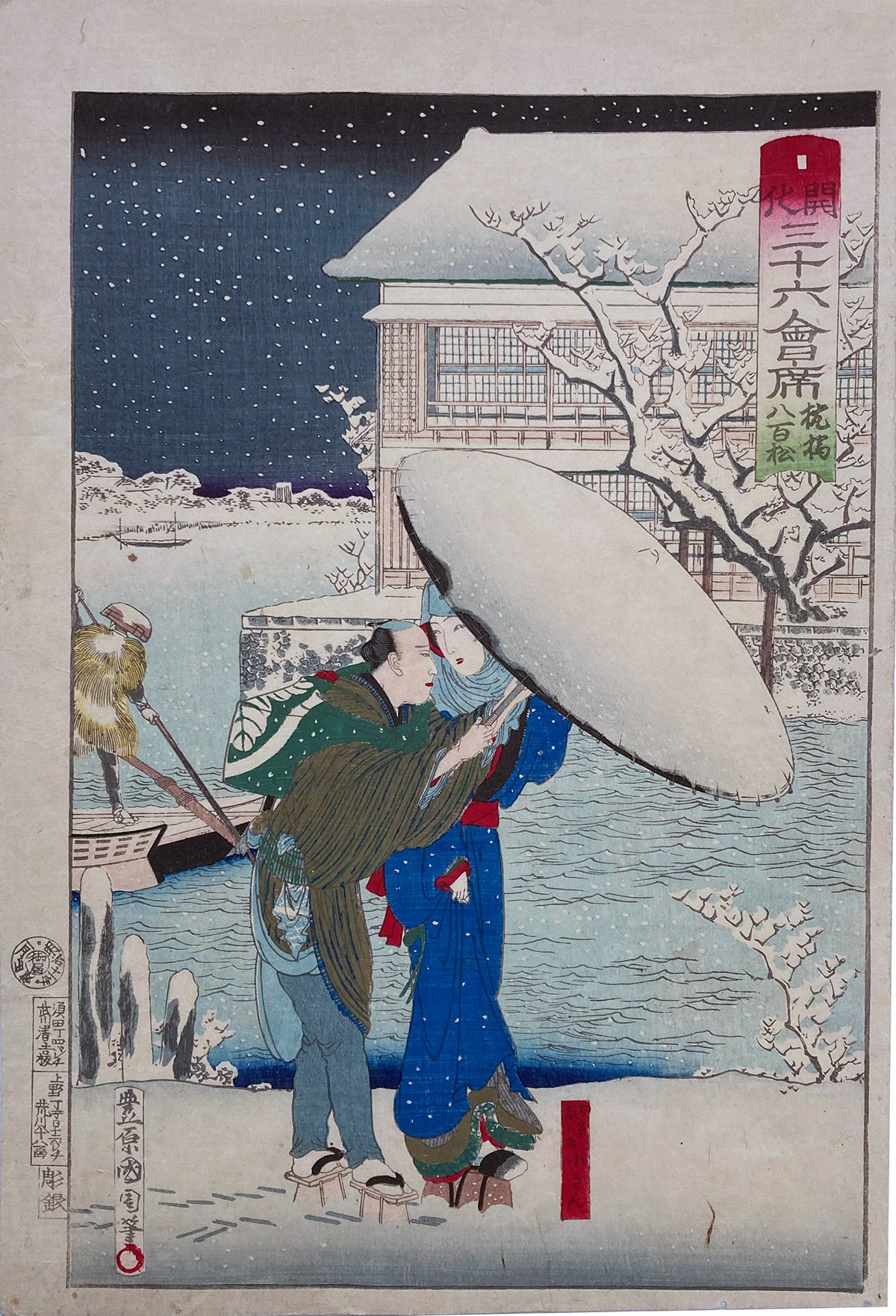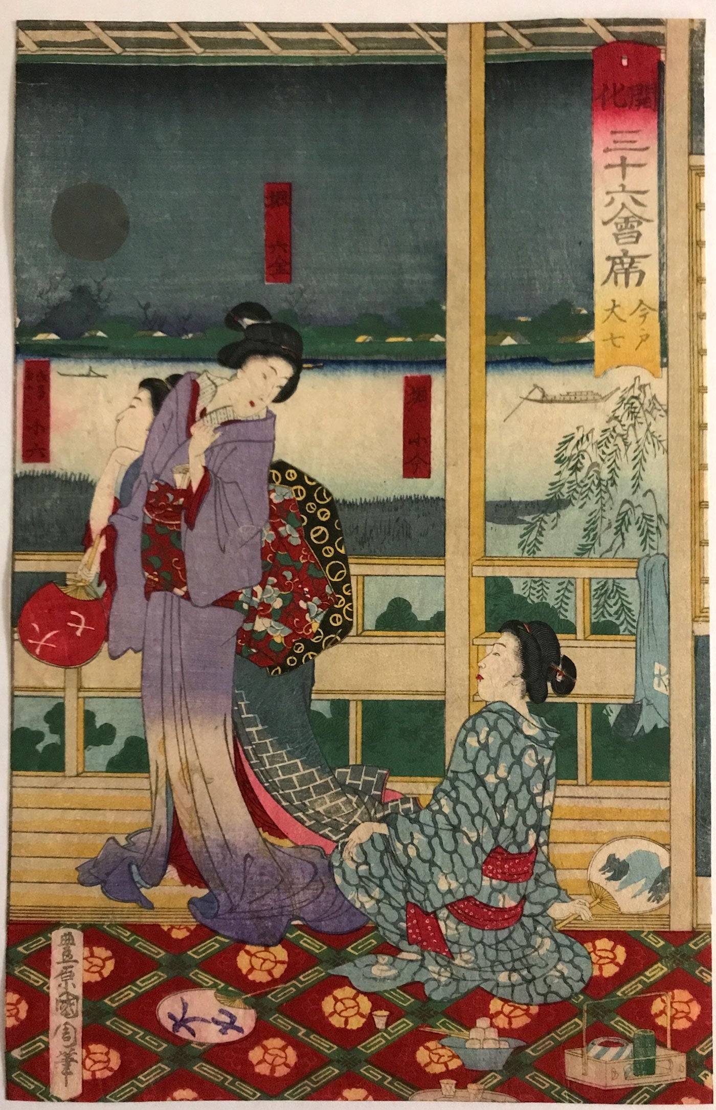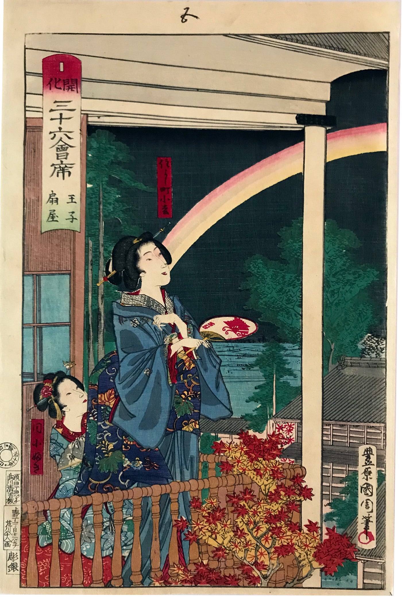 This complete series, published in 1877-1878, demonstrates the commercial ties between businesses, in this case restaurants, and popular artists of the day. Kunichika portrays thirty-six of the most popular restaurants in Japan (actually 37). These prints focus on the interior and exterior architecture, views from the restaurant, attractive customers and restaurant staff, we seldom see actual food. The designs are bold, colorful and provide a snapshot of the fine restaurants and habits of the time.