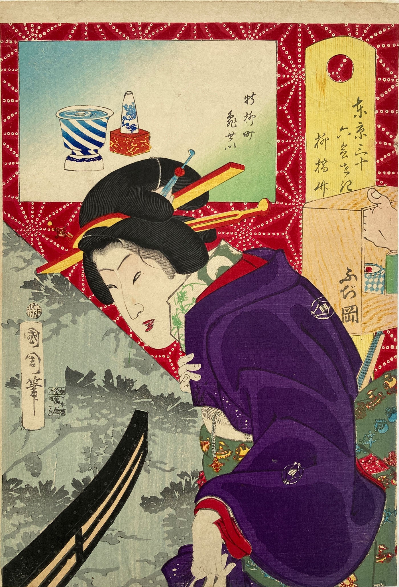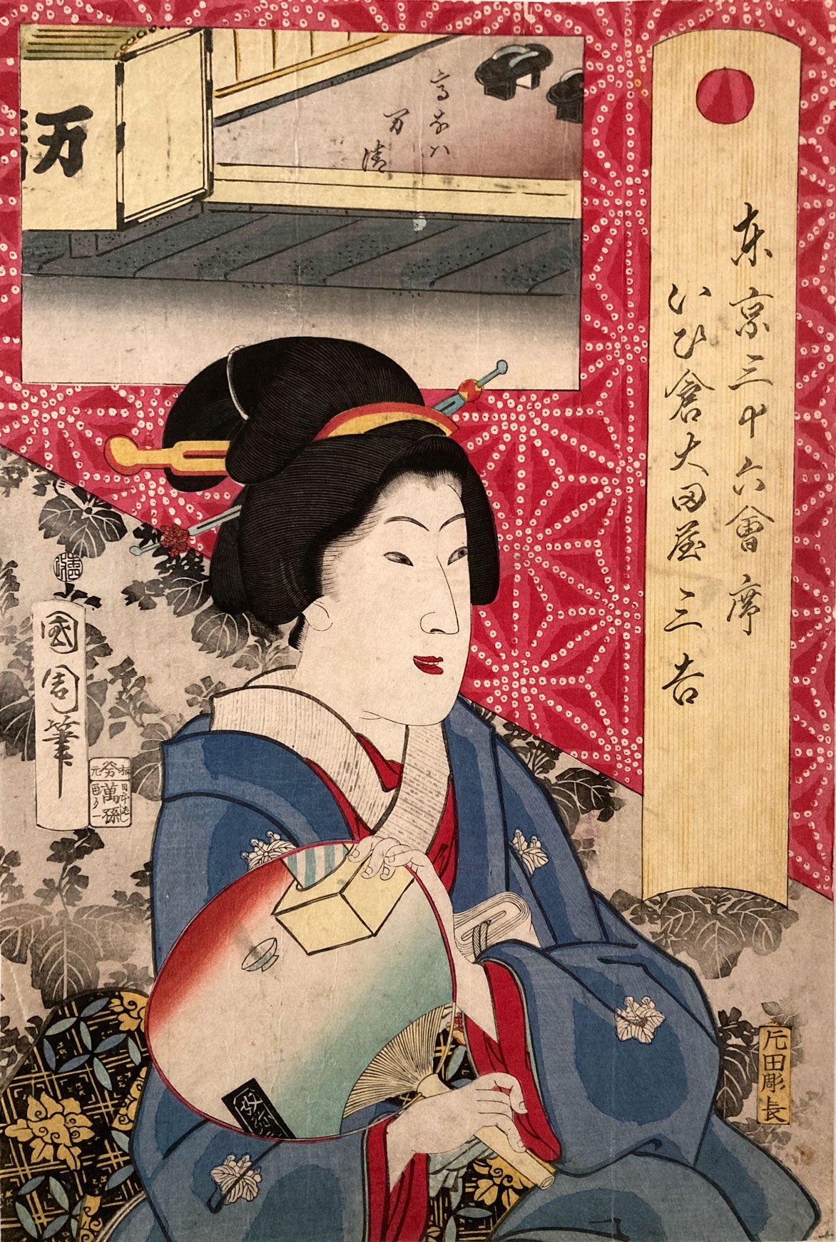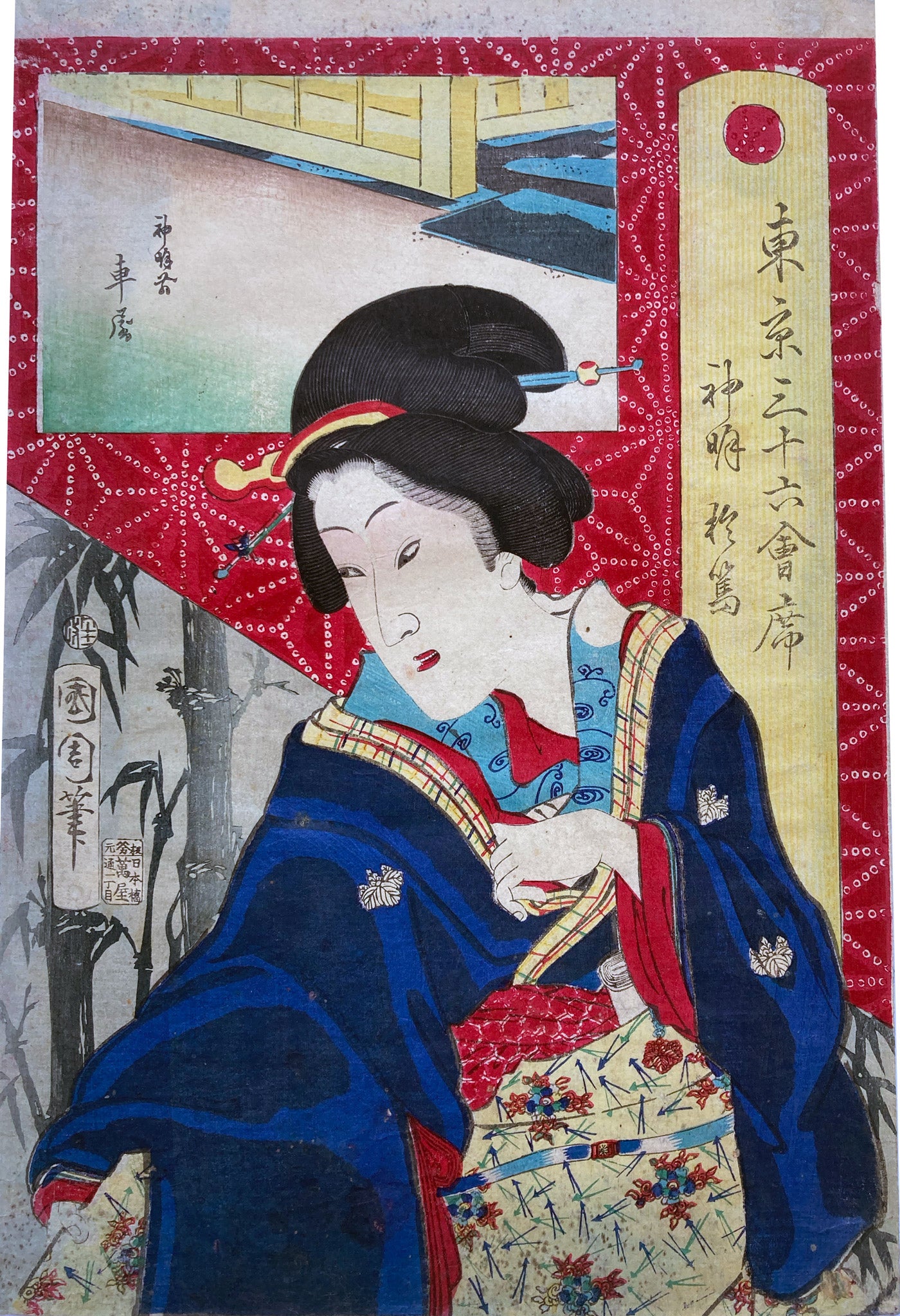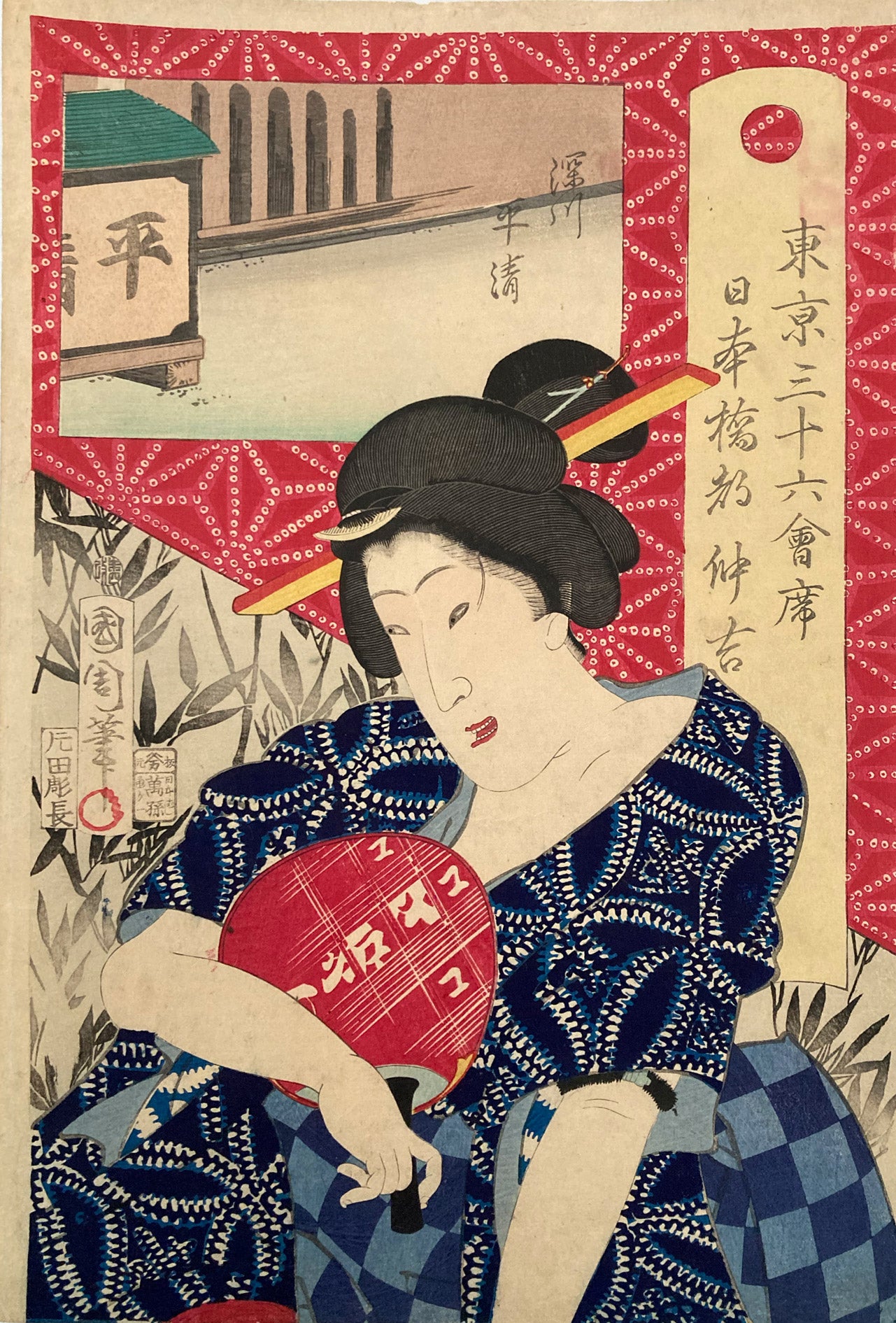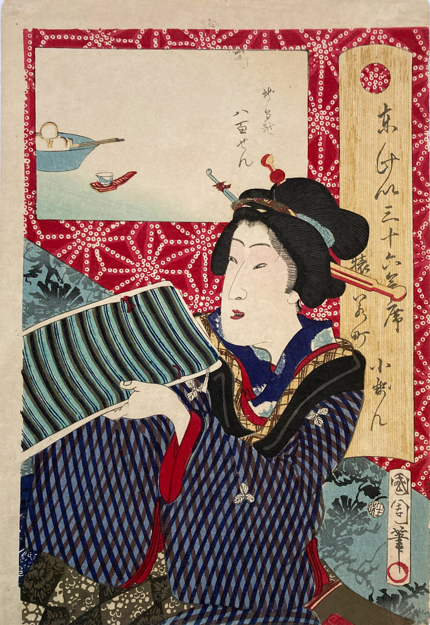 The series "Thirty-six Famous Tokyo Restaurants" by Toyohara Kunichika. This colorful series pairs famous geisha with famous Tokyo eateries. In the series, the rectangular panel at top left shows either speciality dishes or views from the restaurant. The large yellow cartouche on the right shows the series' title, name of the geisha and the restaurant's address. The background is split diagonally with a strong red textile pattern in the top half called "Asa no ha". The Asa no ha pattern is one of the most popular traditional patterns often seen on Japanese kimono. Asa no ha means: Asa = hemp: no = of: ha = leaf. The geometric pattern, represents overlapping hemp leaves.