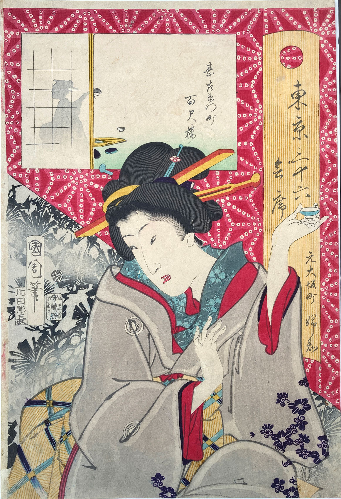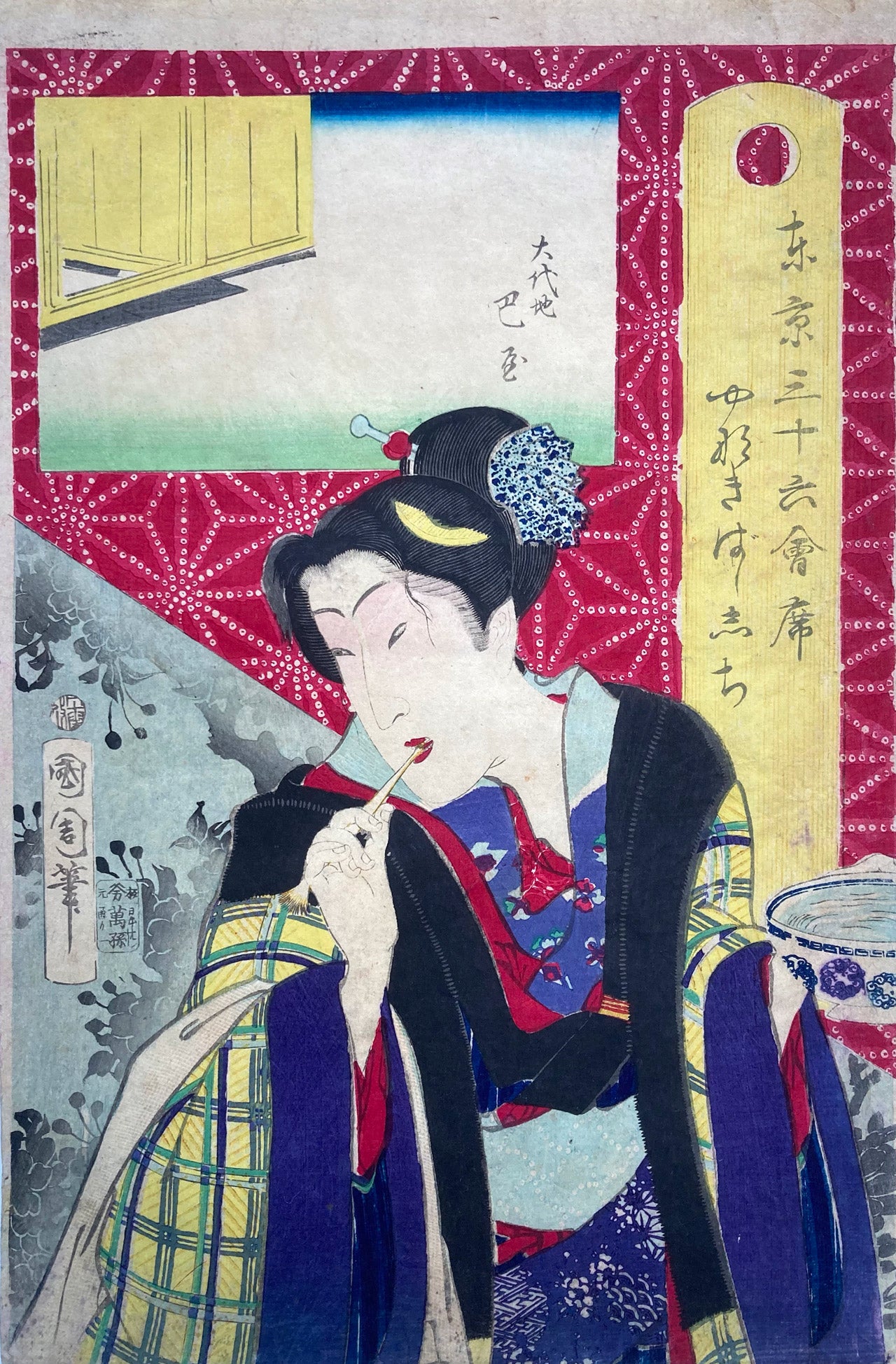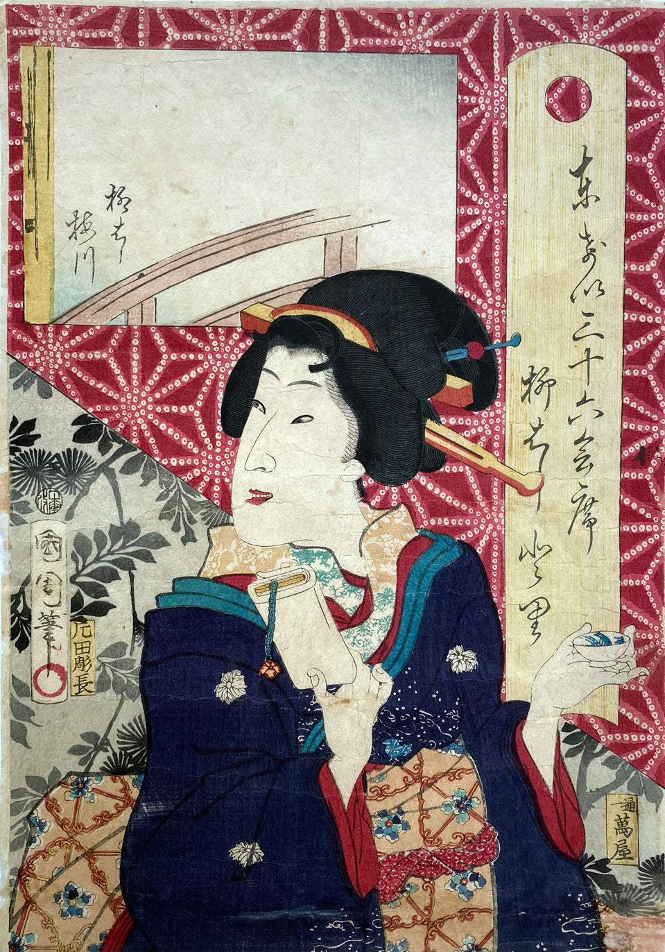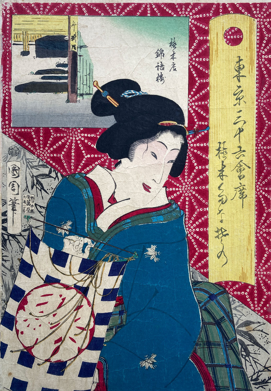 The series "Thirty-six Famous Tokyo Restaurants" by Toyohara Kunichika. This colorful series pairs famous geisha with famous Tokyo eateries. In the series, the rectangular panel at top left shows either speciality dishes or views from the restaurant. The large yellow cartouche on the right shows the series' title, name of the geisha and the restaurant's address. The background is split diagonally with a strong red textile pattern in the top half called "Asa no ha". The Asa no ha pattern is one of the most popular traditional patterns often seen on Japanese kimono. Asa no ha means: Asa = hemp: no = of: ha = leaf. The geometric pattern, represents overlapping hemp leaves.