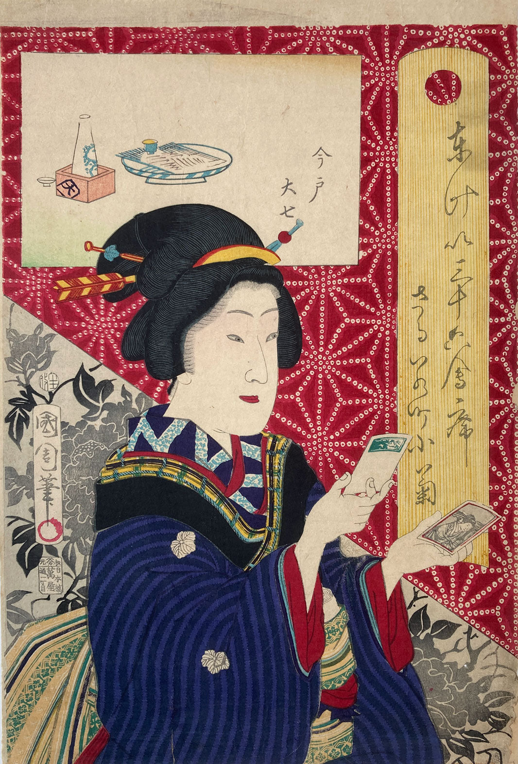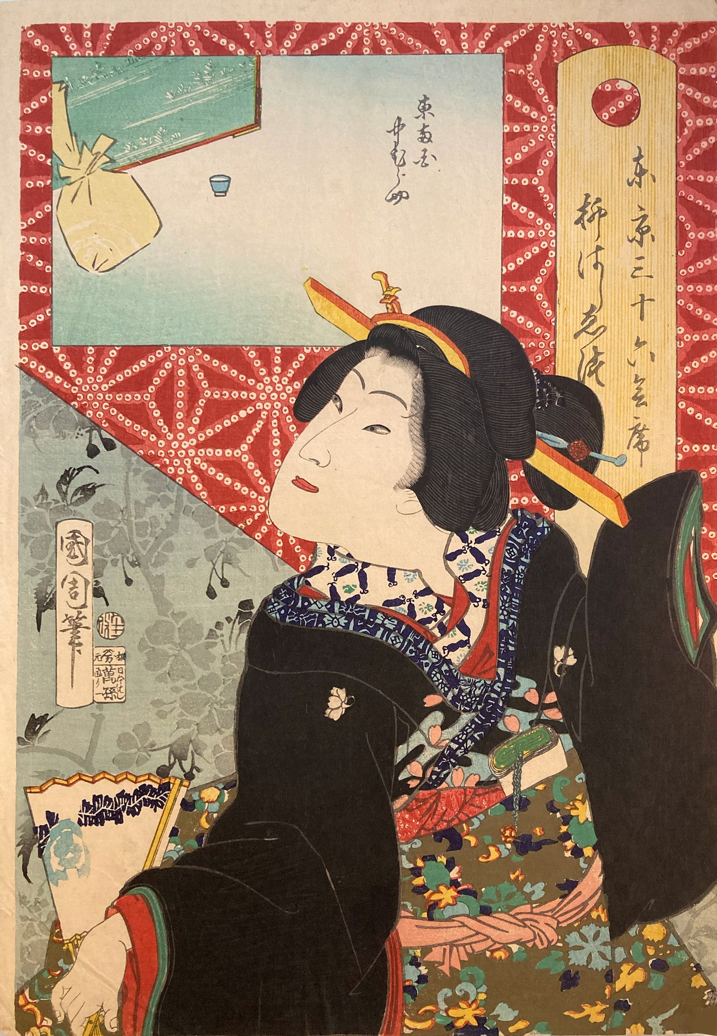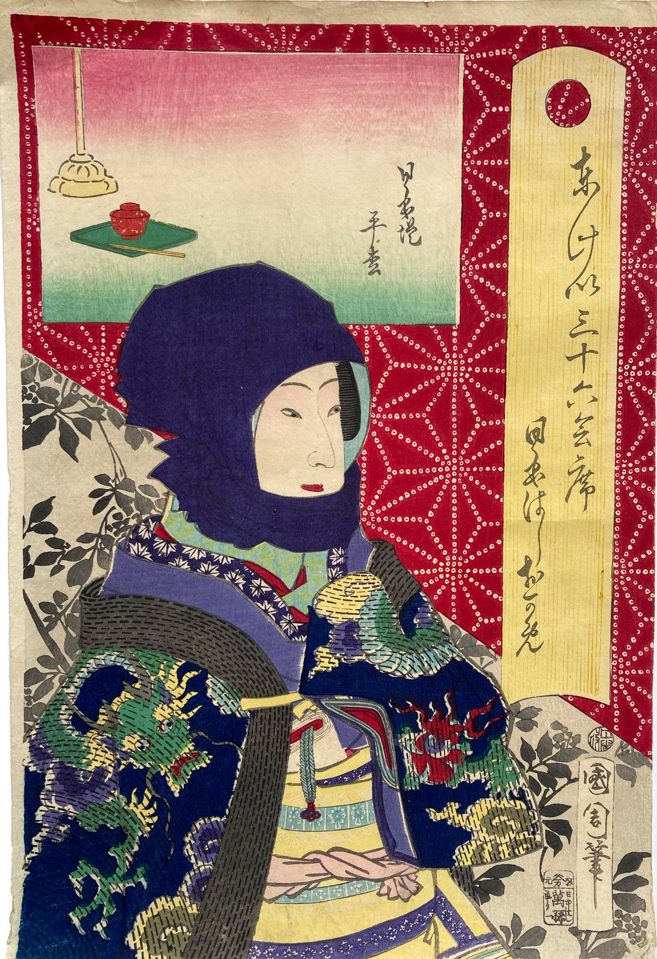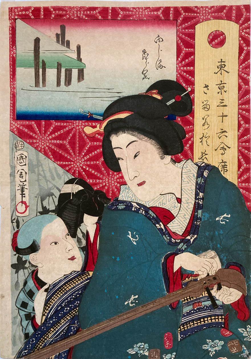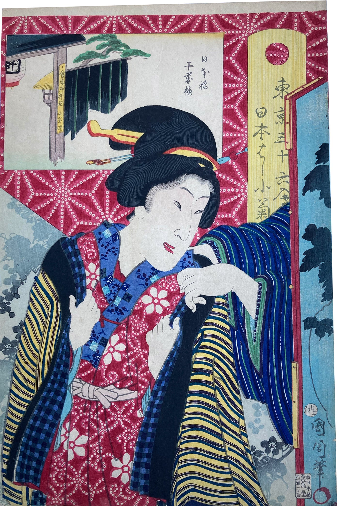 The series "Thirty-six Famous Tokyo Restaurants" by Toyohara Kunichika. This colorful series pairs famous geisha with famous Tokyo eateries. In the series, the rectangular panel at top left shows either speciality dishes or views from the restaurant. The large yellow cartouche on the right shows the series' title, name of the geisha and the restaurant's address. The background is split diagonally with a strong red textile pattern in the top half called "Asa no ha". The Asa no ha pattern is one of the most popular traditional patterns often seen on Japanese kimono. Asa no ha means: Asa = hemp: no = of: ha = leaf. The geometric pattern, represents overlapping hemp leaves.