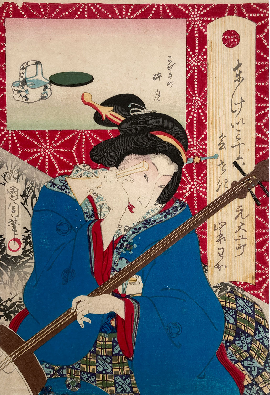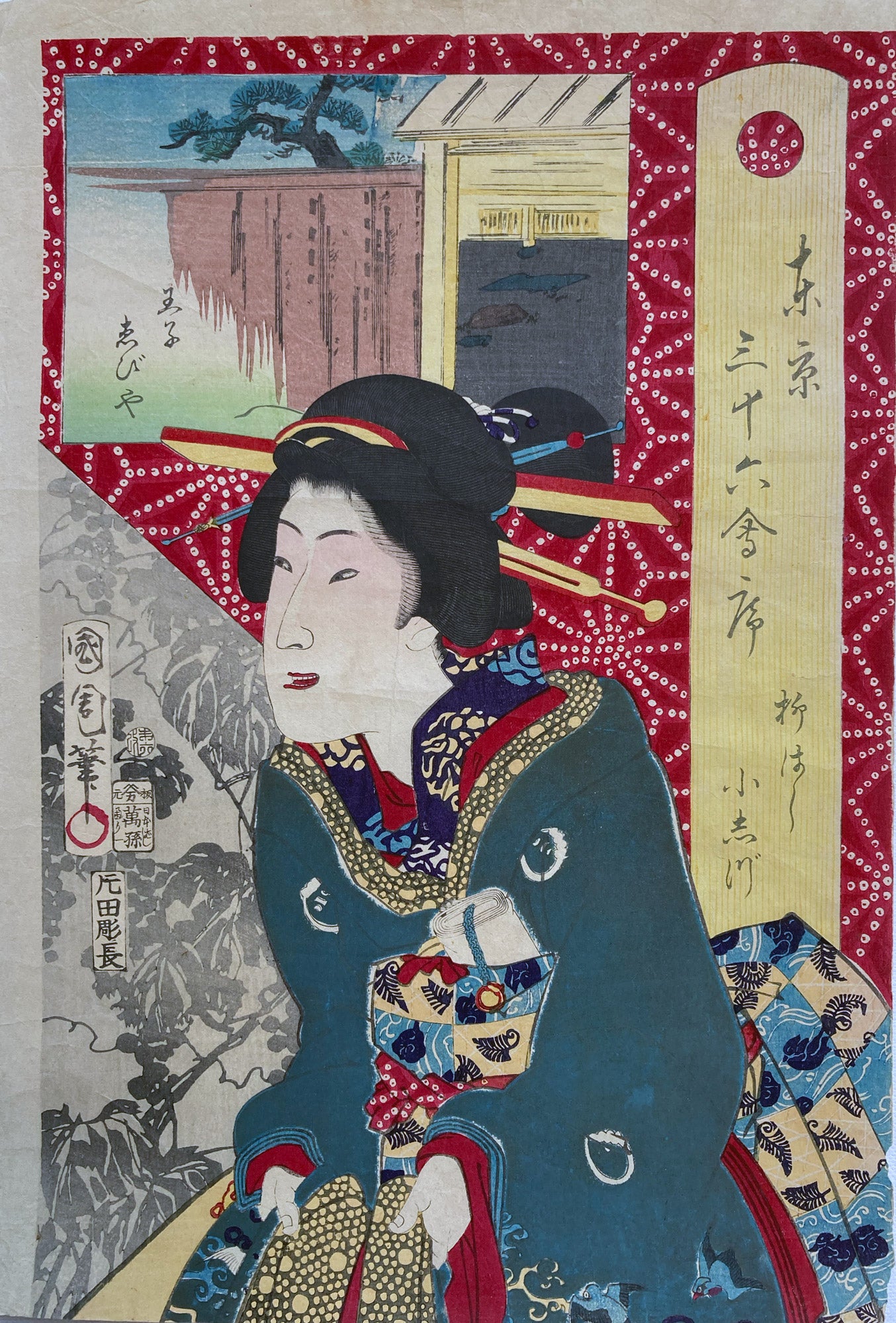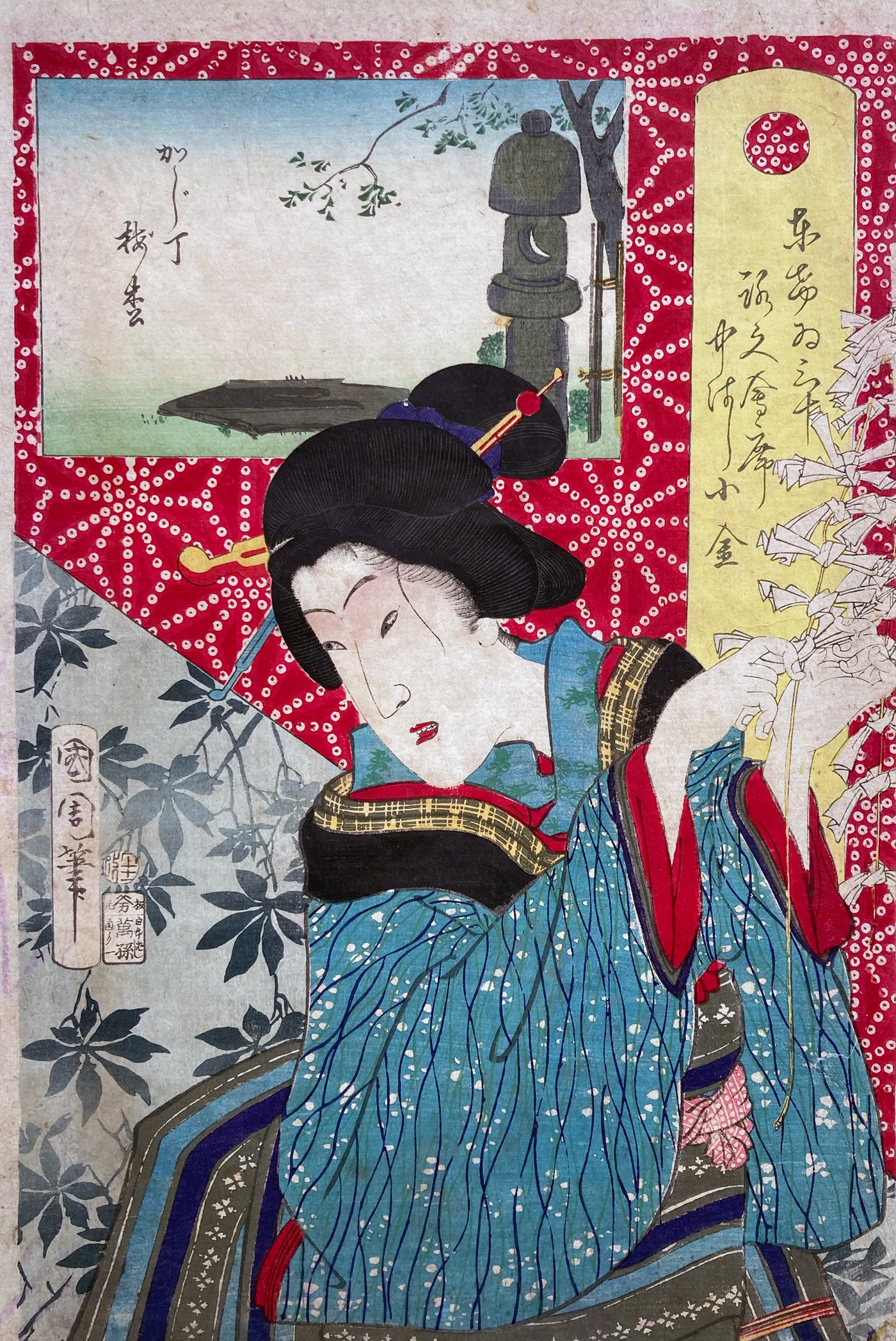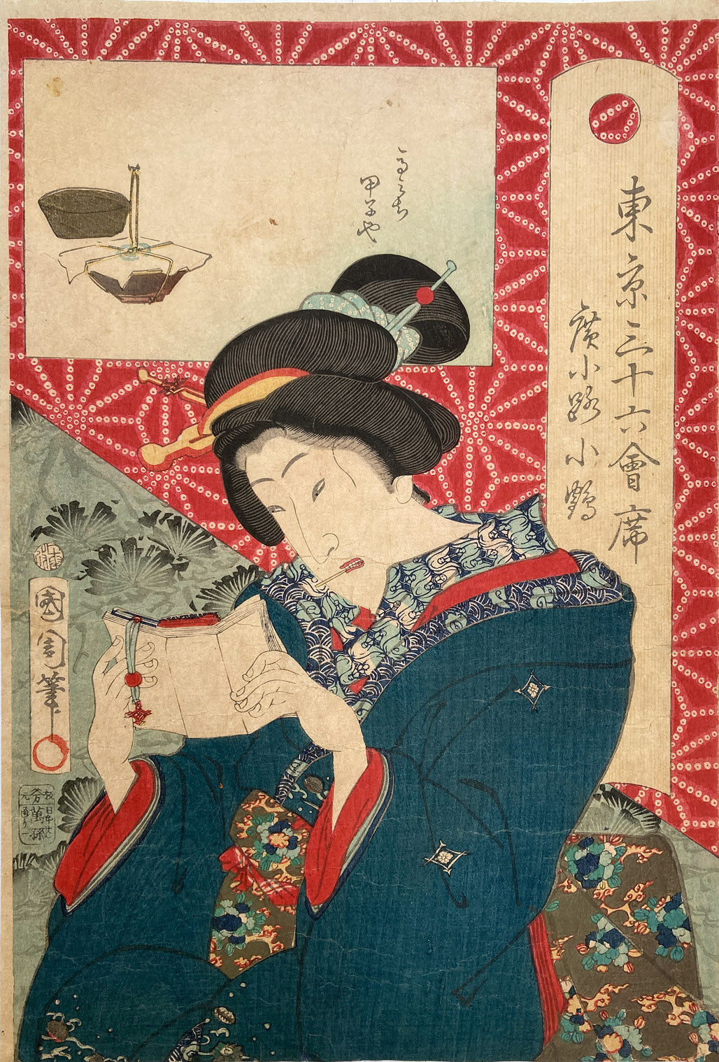 The series "Thirty-six Famous Tokyo Restaurants" by Toyohara Kunichika. This colorful series pairs famous geisha with famous Tokyo eateries. In the series, the rectangular panel at top left shows either speciality dishes or views from the restaurant. The large yellow cartouche on the right shows the series' title, name of the geisha and the restaurant's address. The background is split diagonally with a strong red textile pattern in the top half called "Asa no ha". The Asa no ha pattern is one of the most popular traditional patterns often seen on Japanese kimono. Asa no ha means: Asa = hemp: no = of: ha = leaf. The geometric pattern, represents overlapping hemp leaves.