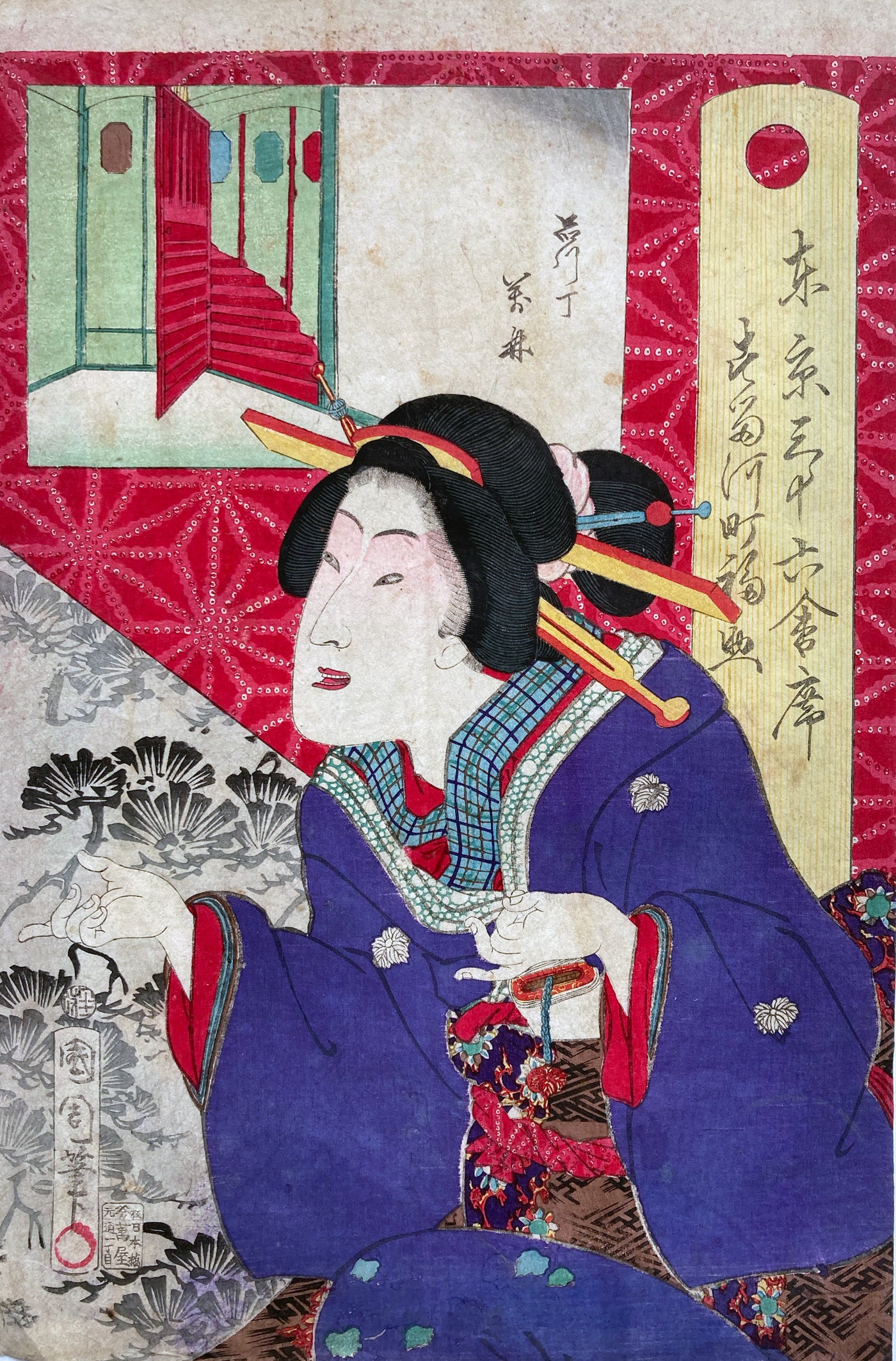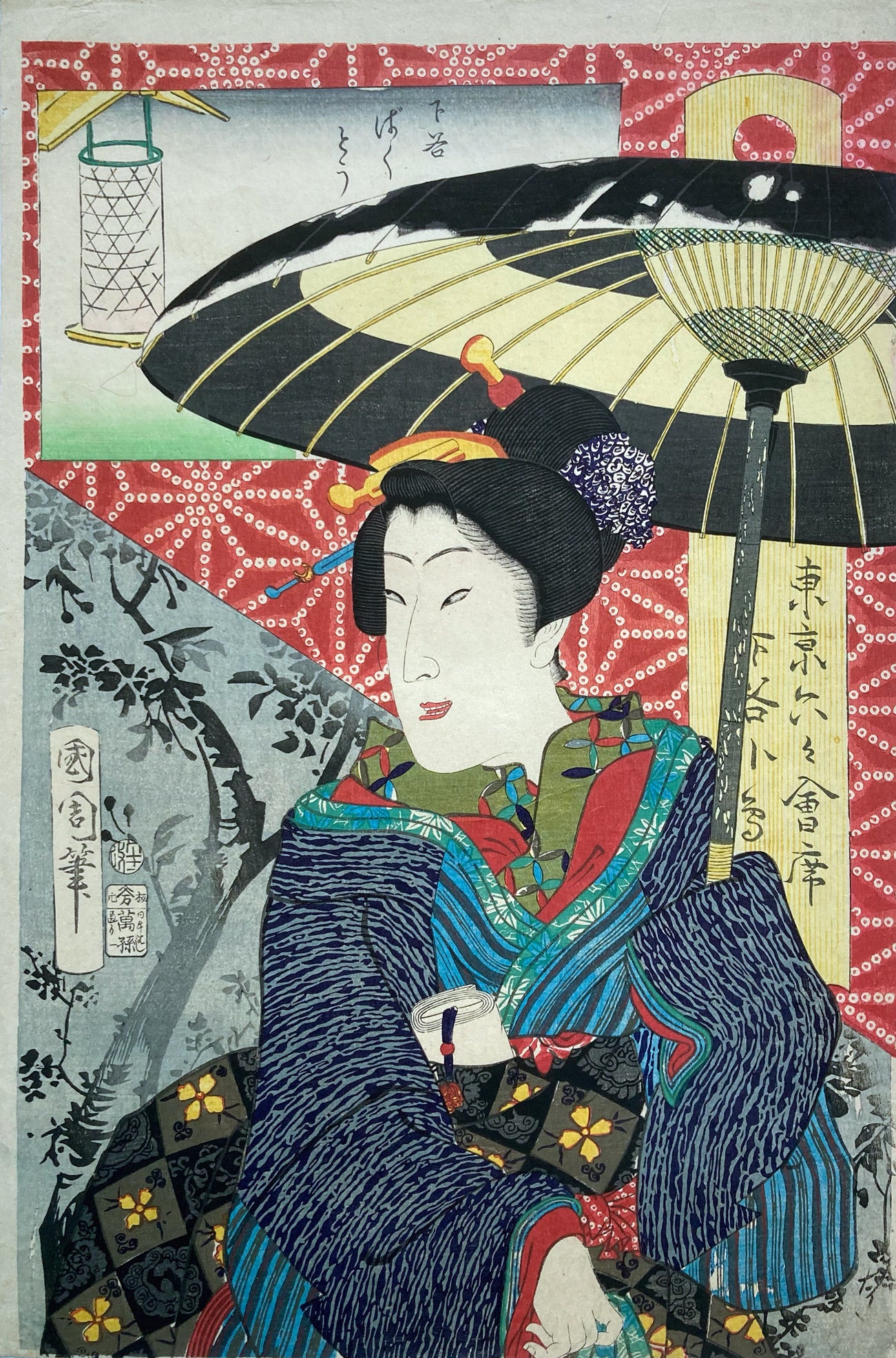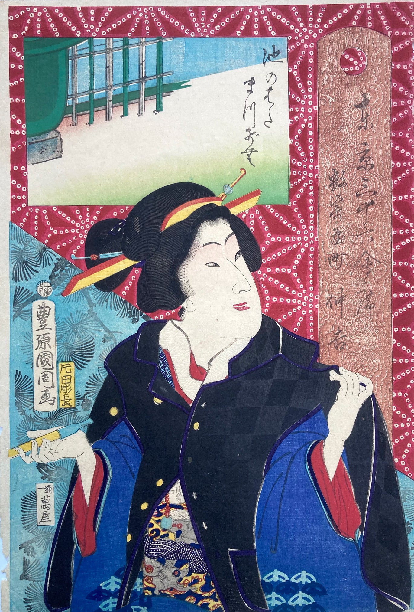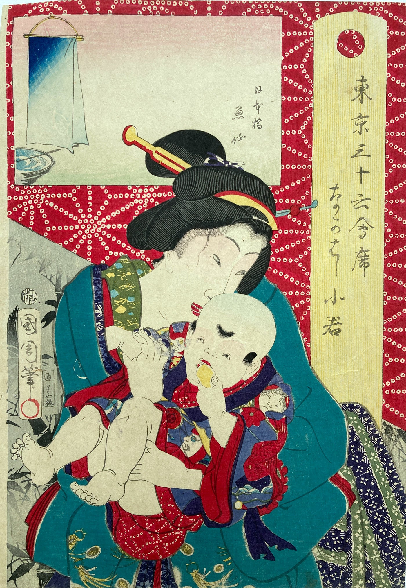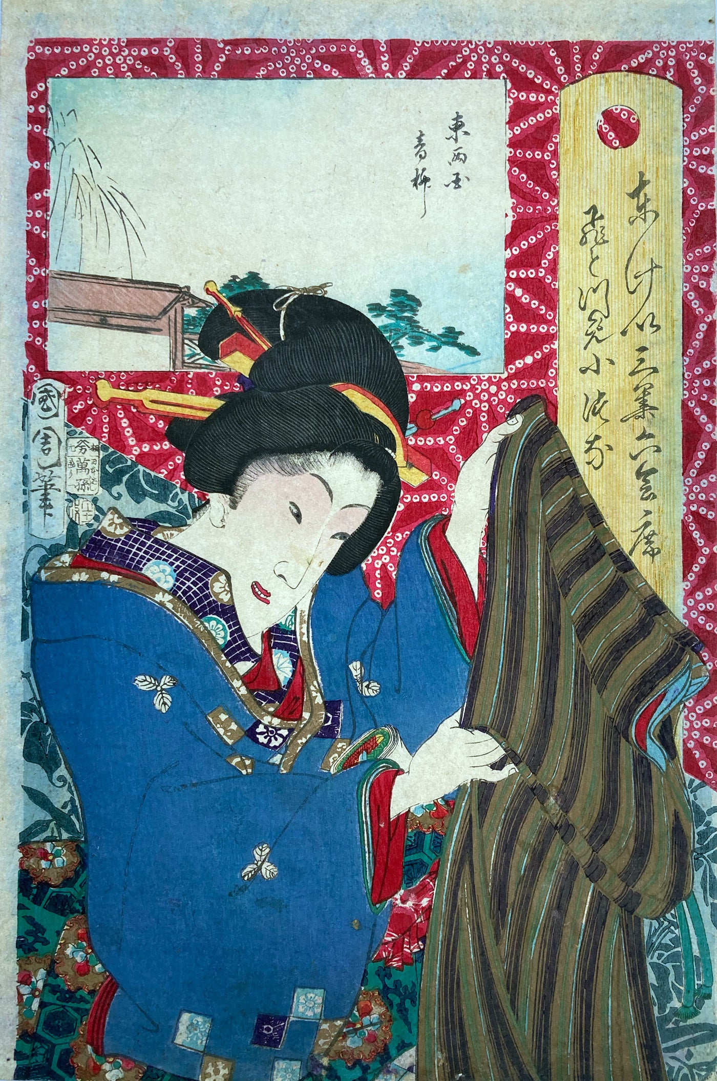 The series "Thirty-six Famous Tokyo Restaurants" by Toyohara Kunichika. This colorful series pairs famous geisha with famous Tokyo eateries. In the series, the rectangular panel at top left shows either speciality dishes or views from the restaurant. The large yellow cartouche on the right shows the series' title, name of the geisha and the restaurant's address. The background is split diagonally with a strong red textile pattern in the top half called "Asa no ha". The Asa no ha pattern is one of the most popular traditional patterns often seen on Japanese kimono. Asa no ha means: Asa = hemp: no = of: ha = leaf. The geometric pattern, represents overlapping hemp leaves.
