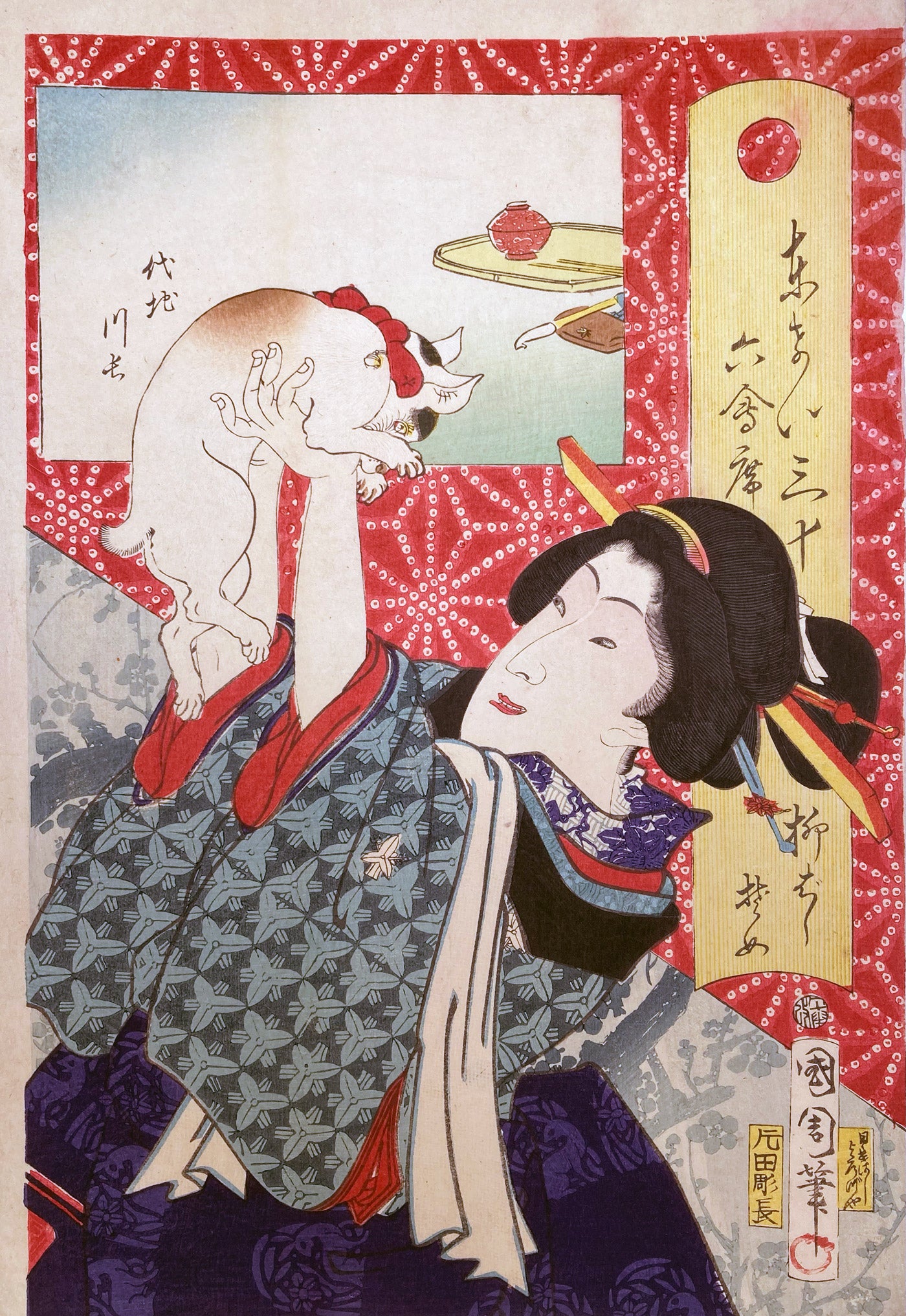 Portrait of the geisha Some of Yanagibashi holding a cat.