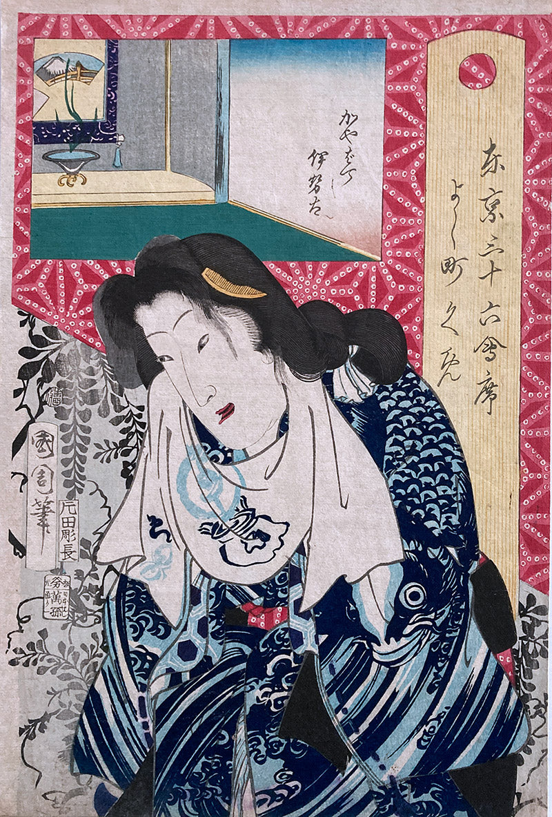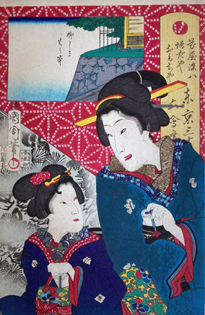 This series borrows heavily from his early series The First Mists of Spring both in design and composition but also in the delicately shaded background of leaves. This series, along with Kunichika's other series "Thirty-Six Famous Modern Restaurants" are wonderfully designed and produced. The complex patterns, dynamic compositions, beautiful portraits of geisha, and interesting scenes are a major reason for the success of this print series.