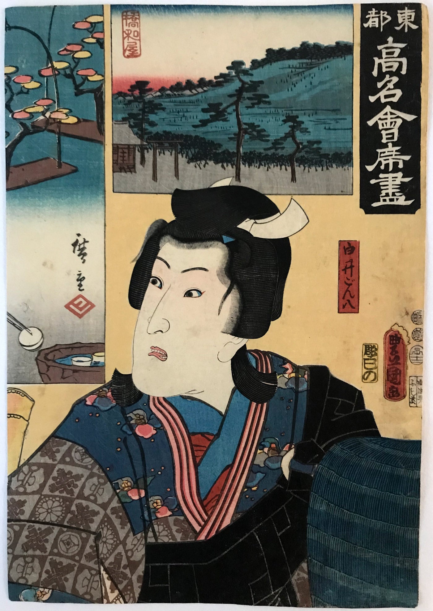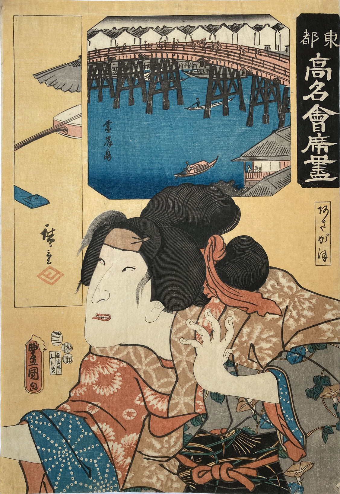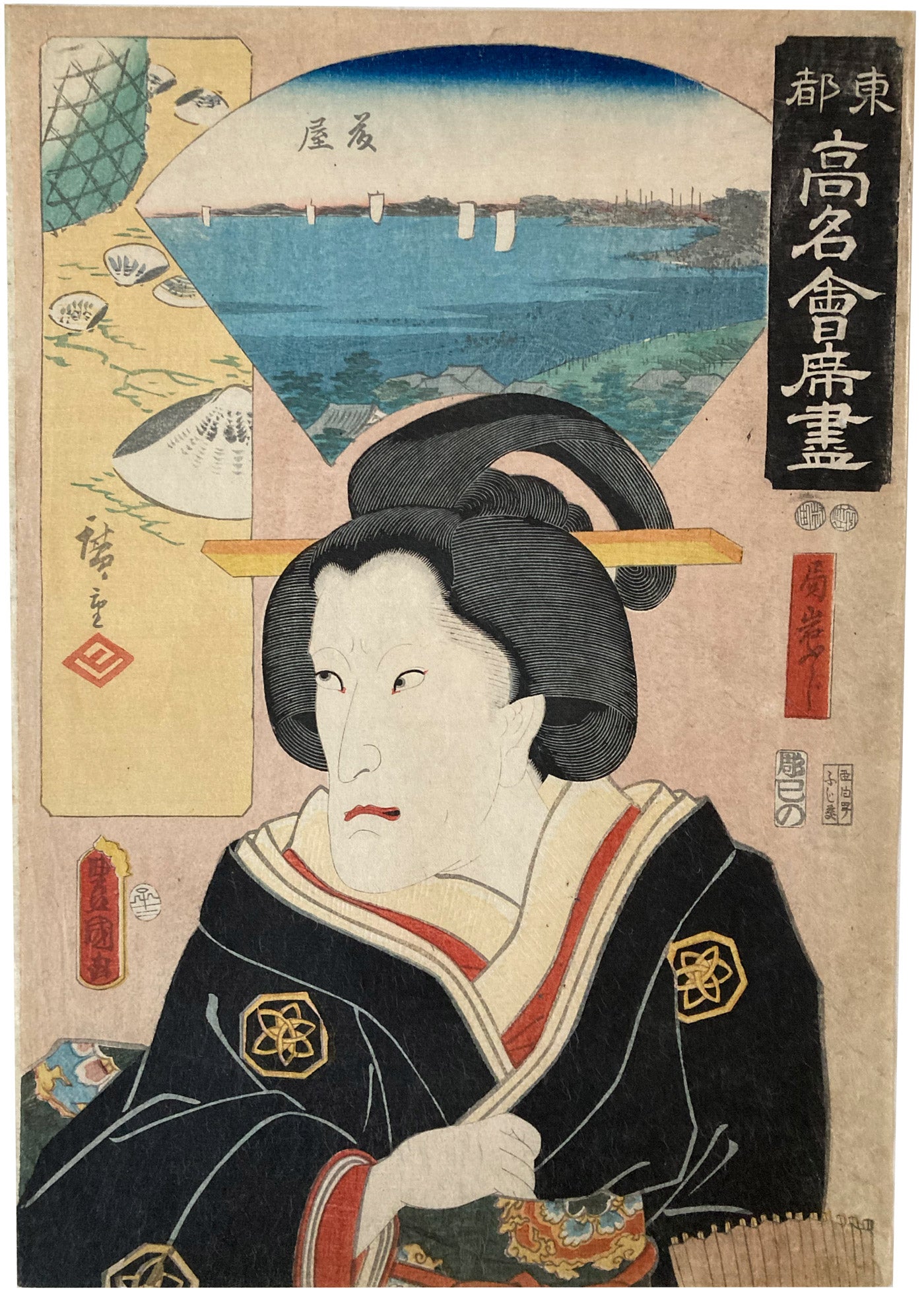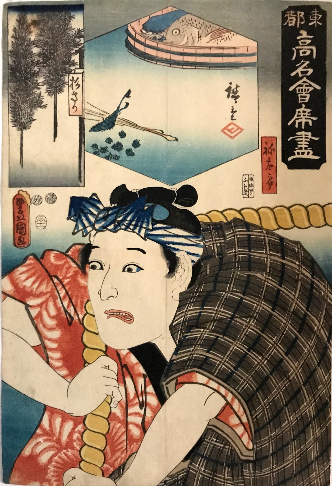 Kunisada designed the actor images in the foreground, while Hiroshige designed the inset landscapes, likely representing scenes near the respective restaurants. Our collection consists of about 20 of the 50 prints from this series. For more insights, check our YouTube video onJapanese Restaurant Prints. Fans of this collaboration might also appreciate the Kunisada and Hiroshige series “The 53 Stations by Two Brushes”. The prints are not presented in a particular sequence.
