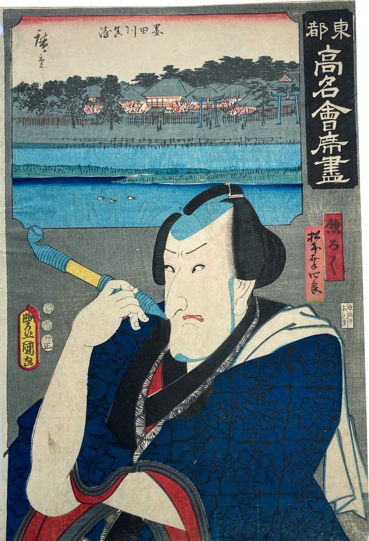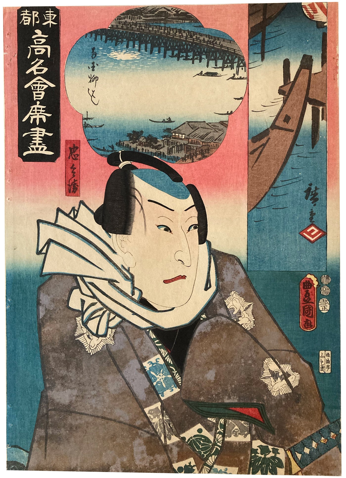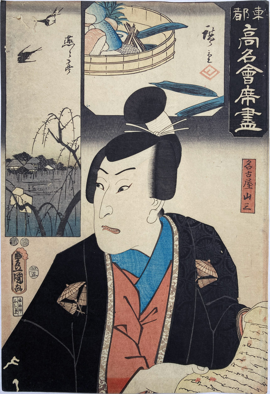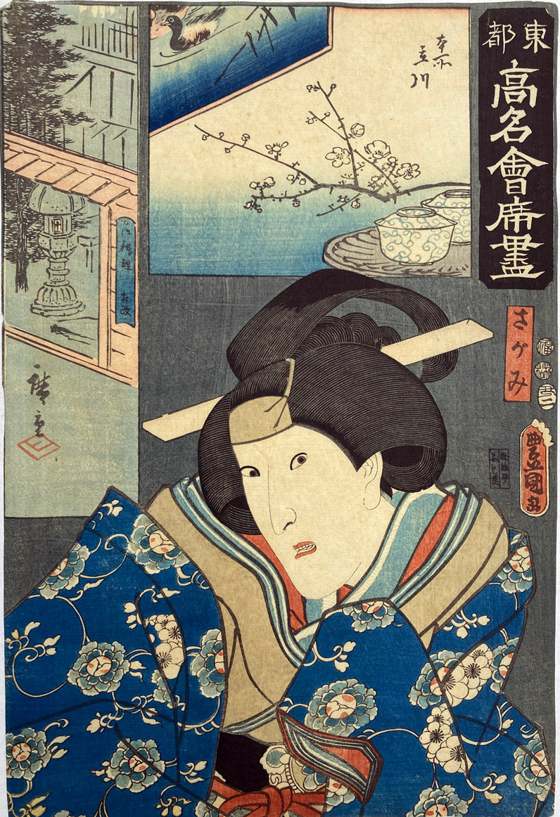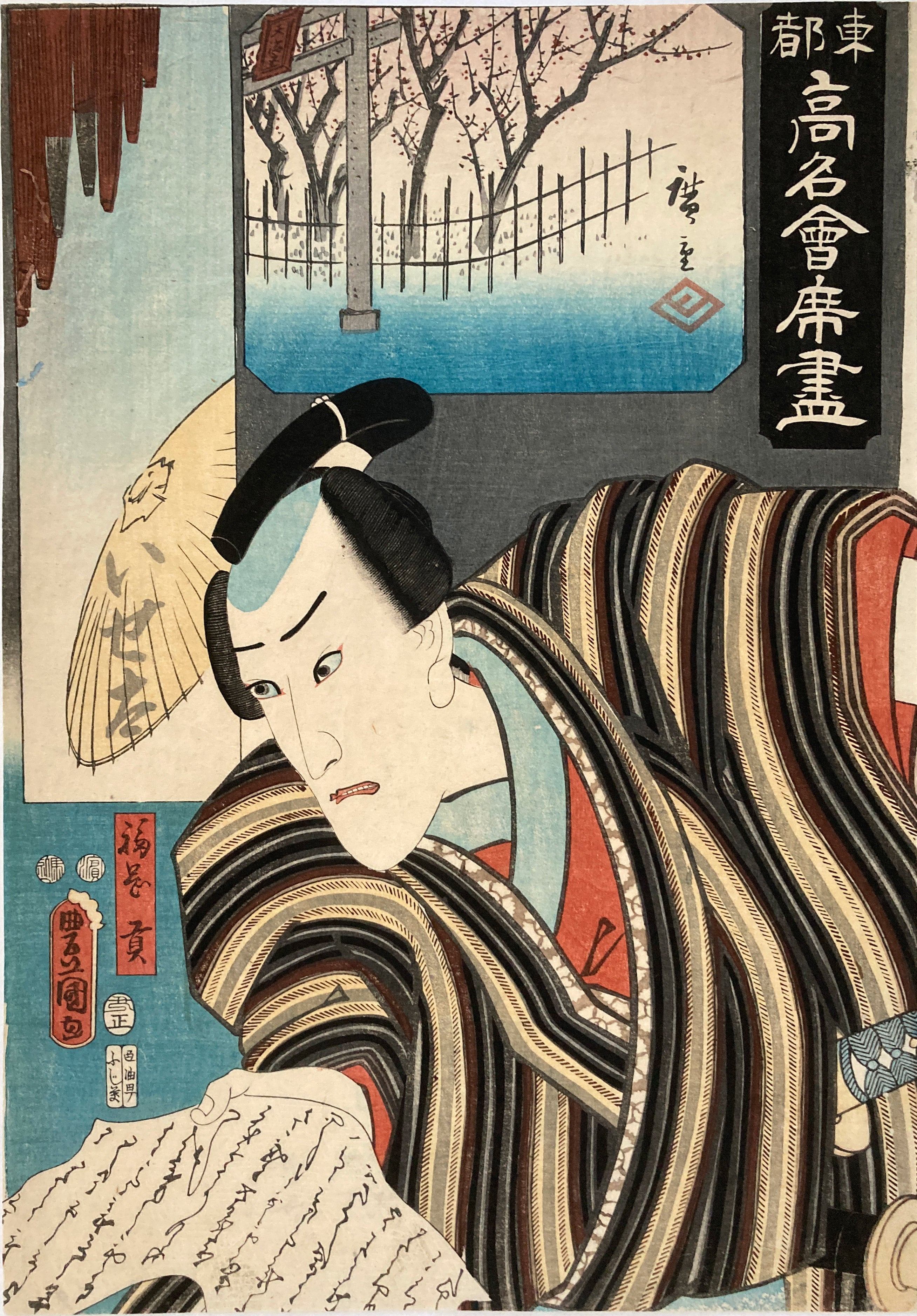 Kunisada designed the actor images in the foreground, while Hiroshige designed the inset landscapes, likely representing scenes near the respective restaurants. Our collection consists of about 20 of the 50 prints from this series. For more insights, check our YouTube video onJapanese Restaurant Prints. Fans of this collaboration might also appreciate the Kunisada and Hiroshige series “The 53 Stations by Two Brushes”. The prints are not presented in a particular sequence.
