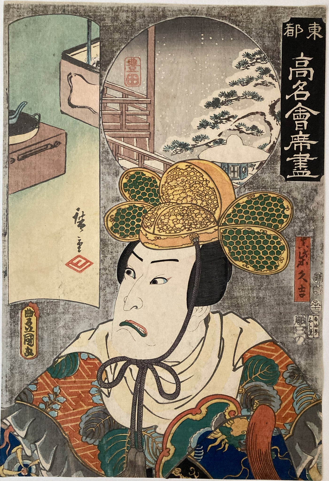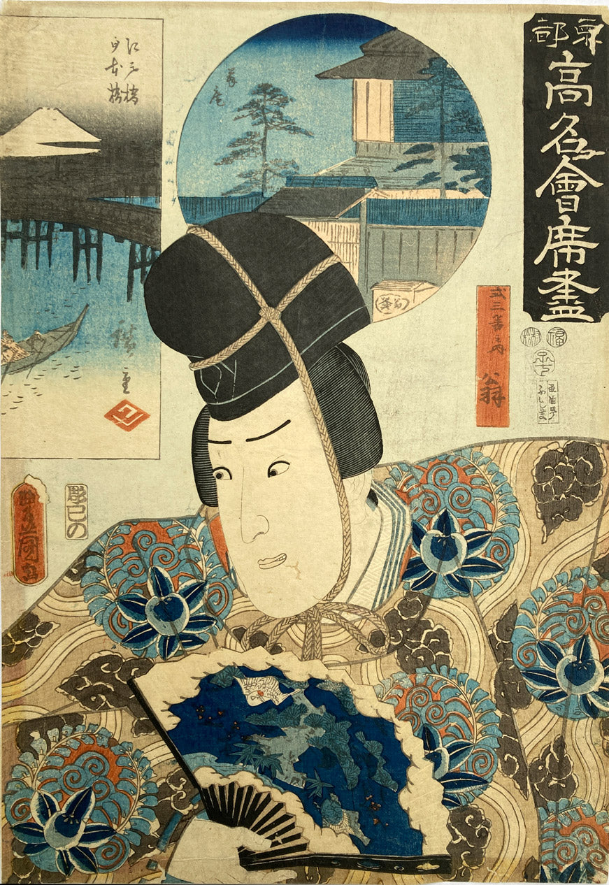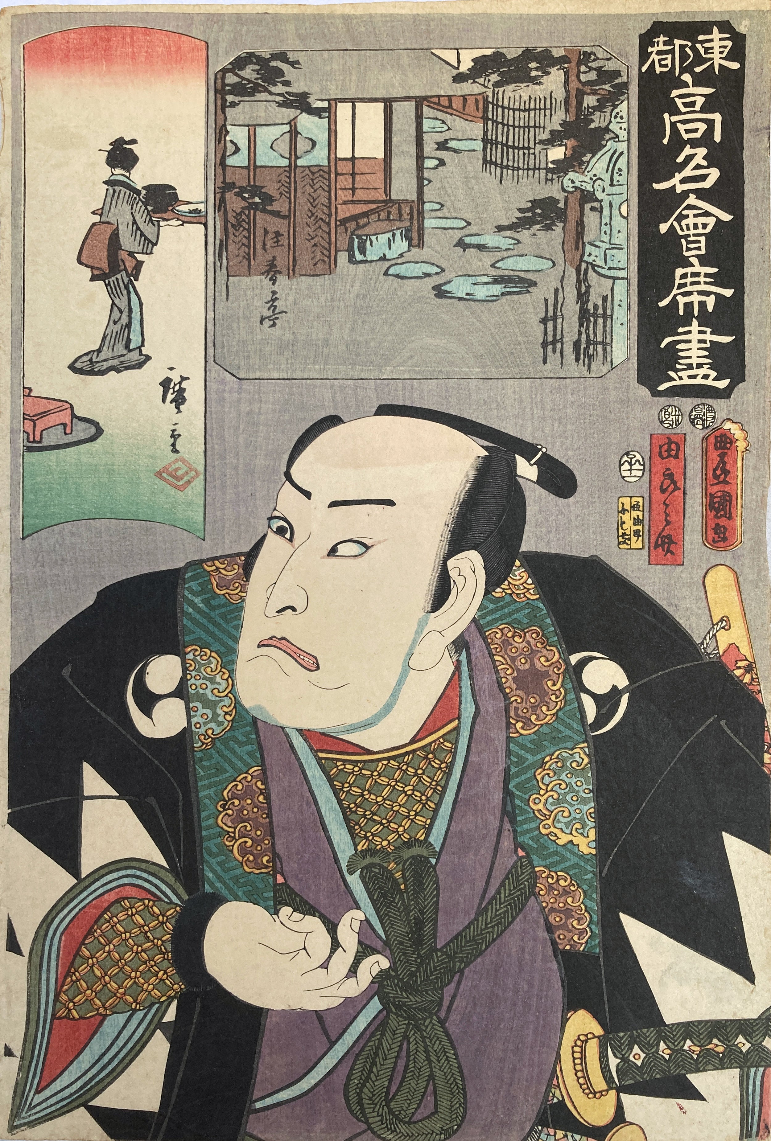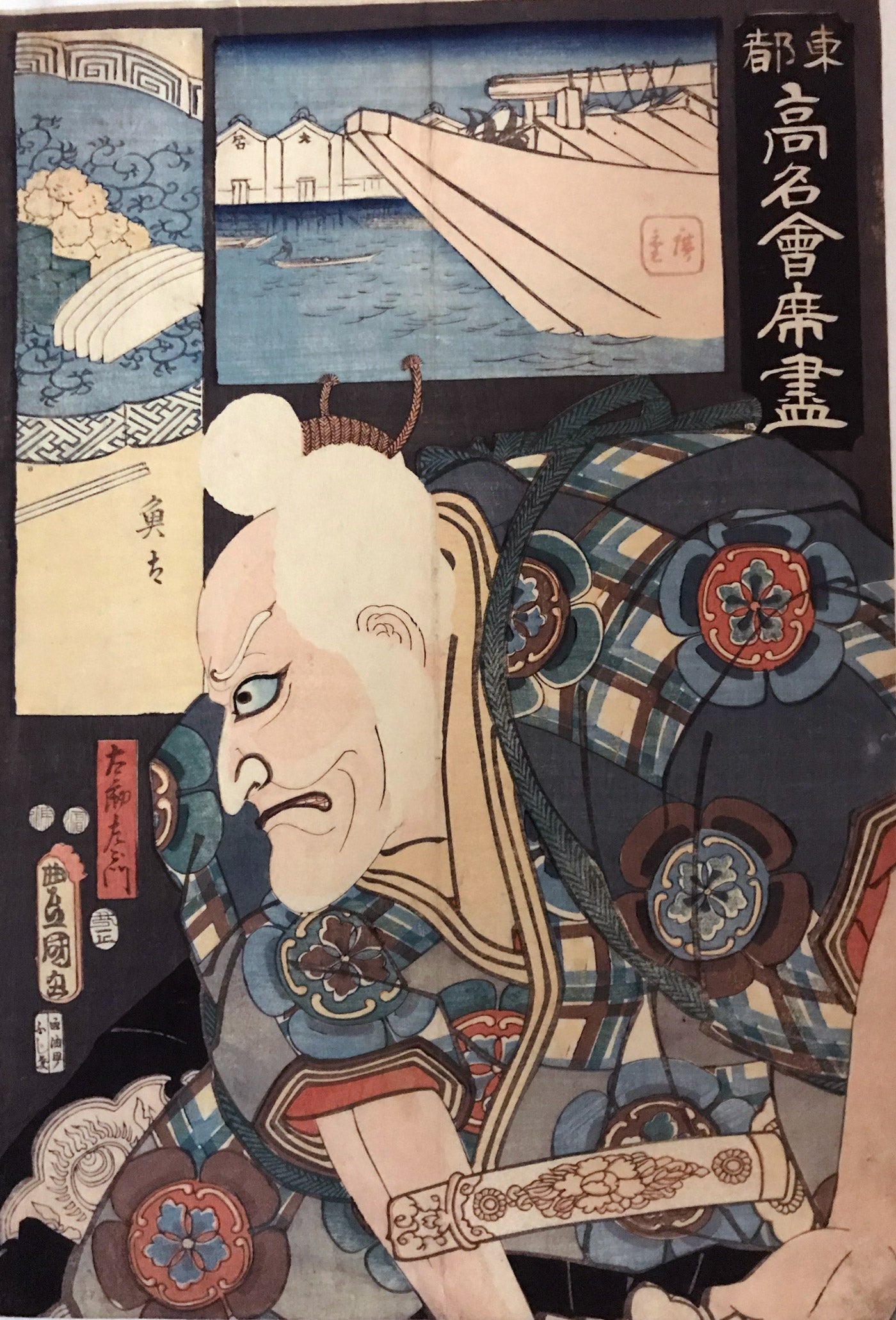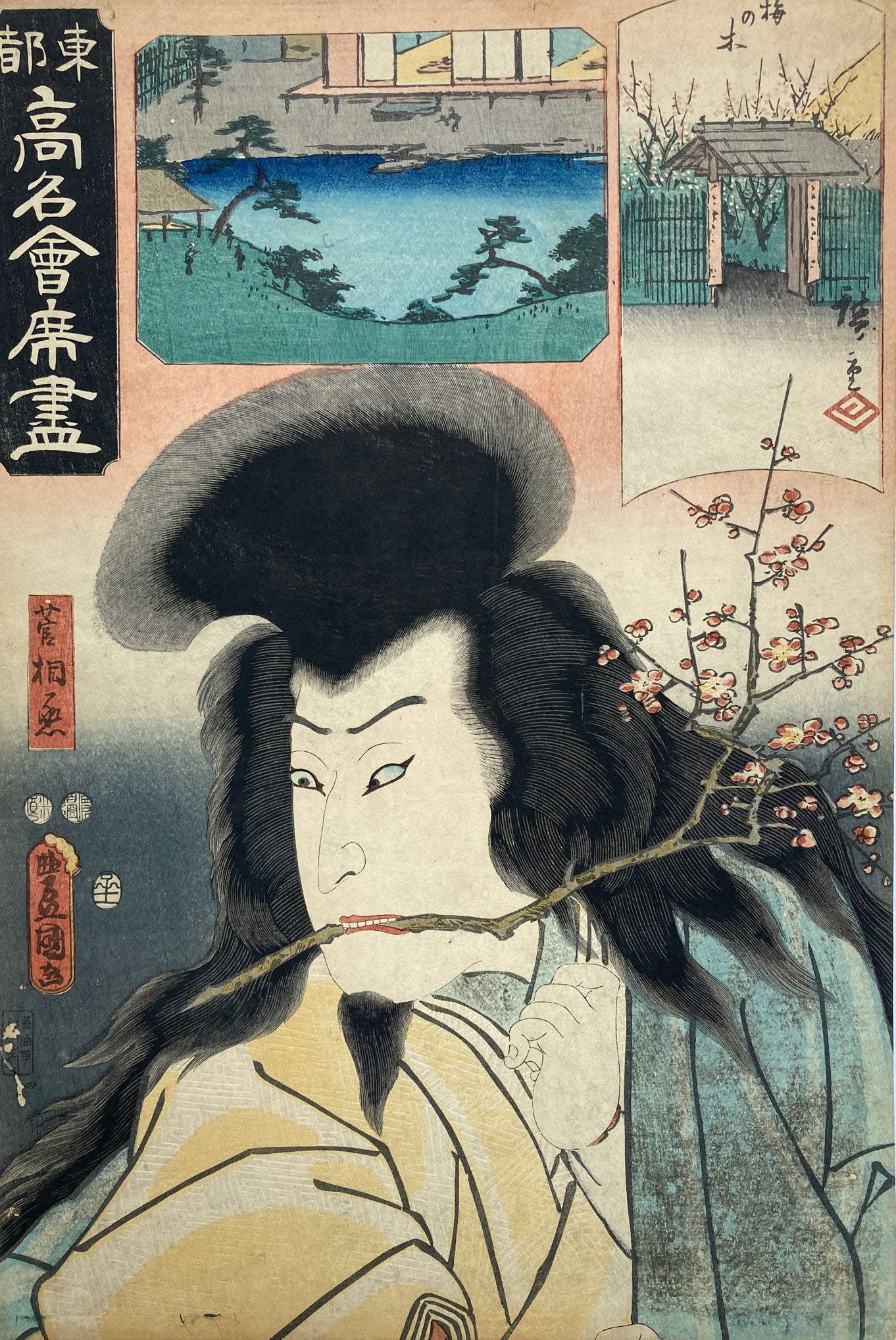 Kunisada designed the actor images in the foreground, while Hiroshige designed the inset landscapes, likely representing scenes near the respective restaurants. Our collection consists of about 20 of the 50 prints from this series. For more insights, check our YouTube video onJapanese Restaurant Prints. Fans of this collaboration might also appreciate the Kunisada and Hiroshige series “The 53 Stations by Two Brushes”. The prints are not presented in a particular sequence.