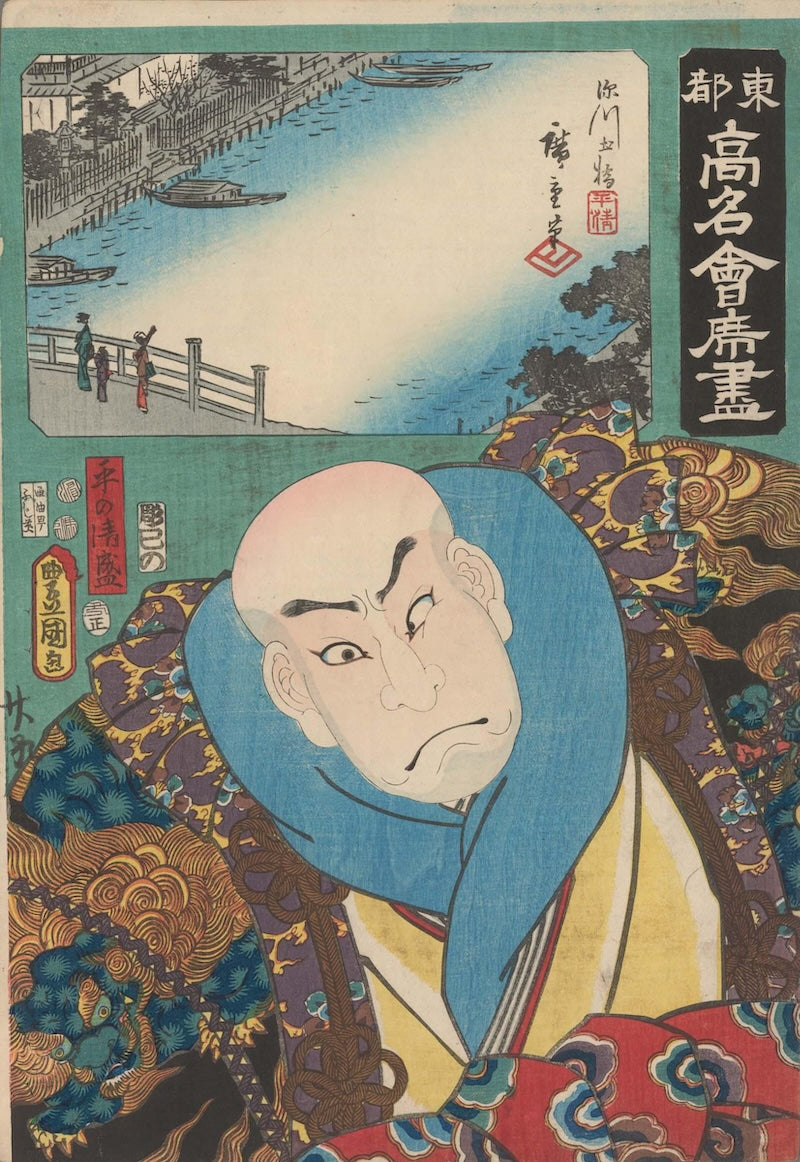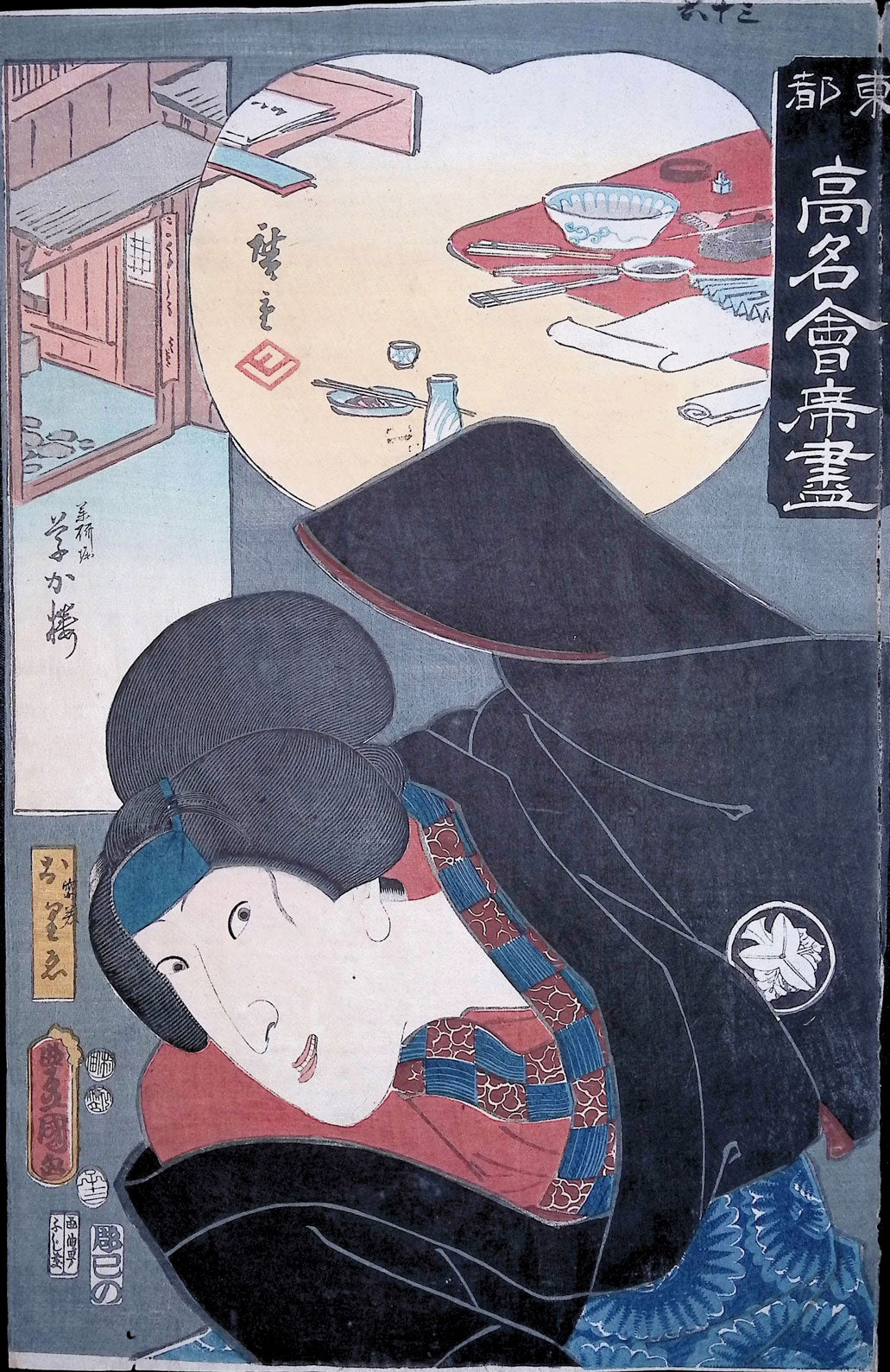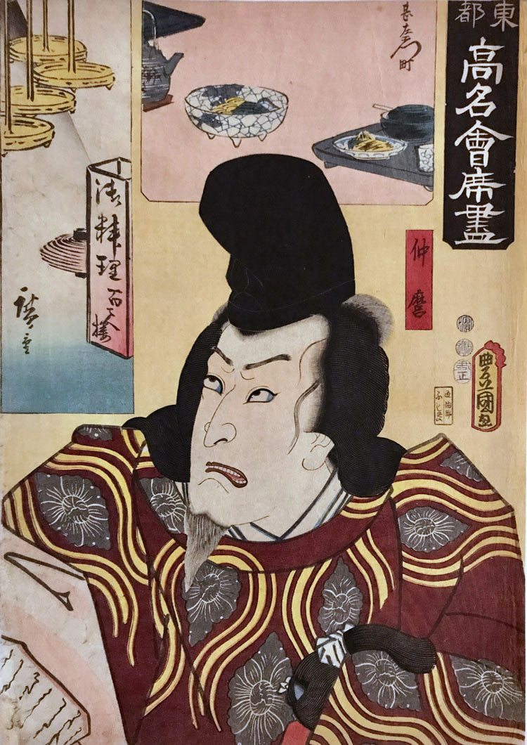 This exciting collaborative restaurant series was designed by Kunisada (Toyokuni III) and Ando Hiroshige in 1852/53. Tōto kōmei kaiseki tsukushi (東都高名会席尽). The series was published by Fujiokaya Keijiro. View pictures of most of the prints at theKunisada.de website.