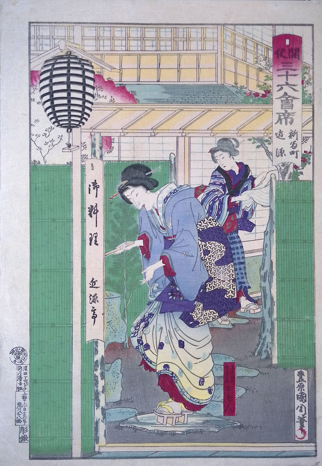 This complete series, published in 1877-1878, demonstrates the commercial ties between businesses, in this case restaurants, and popular artists of the day. Kunichika portrays thirty-six of the most popular restaurants in Japan (actually 37). These prints focus on the interior and exterior architecture, views from the restaurant, attractive customers and restaurant staff, we seldom see actual food. The designs are bold, colorful and provide a snapshot of the fine restaurants and habits of the time.