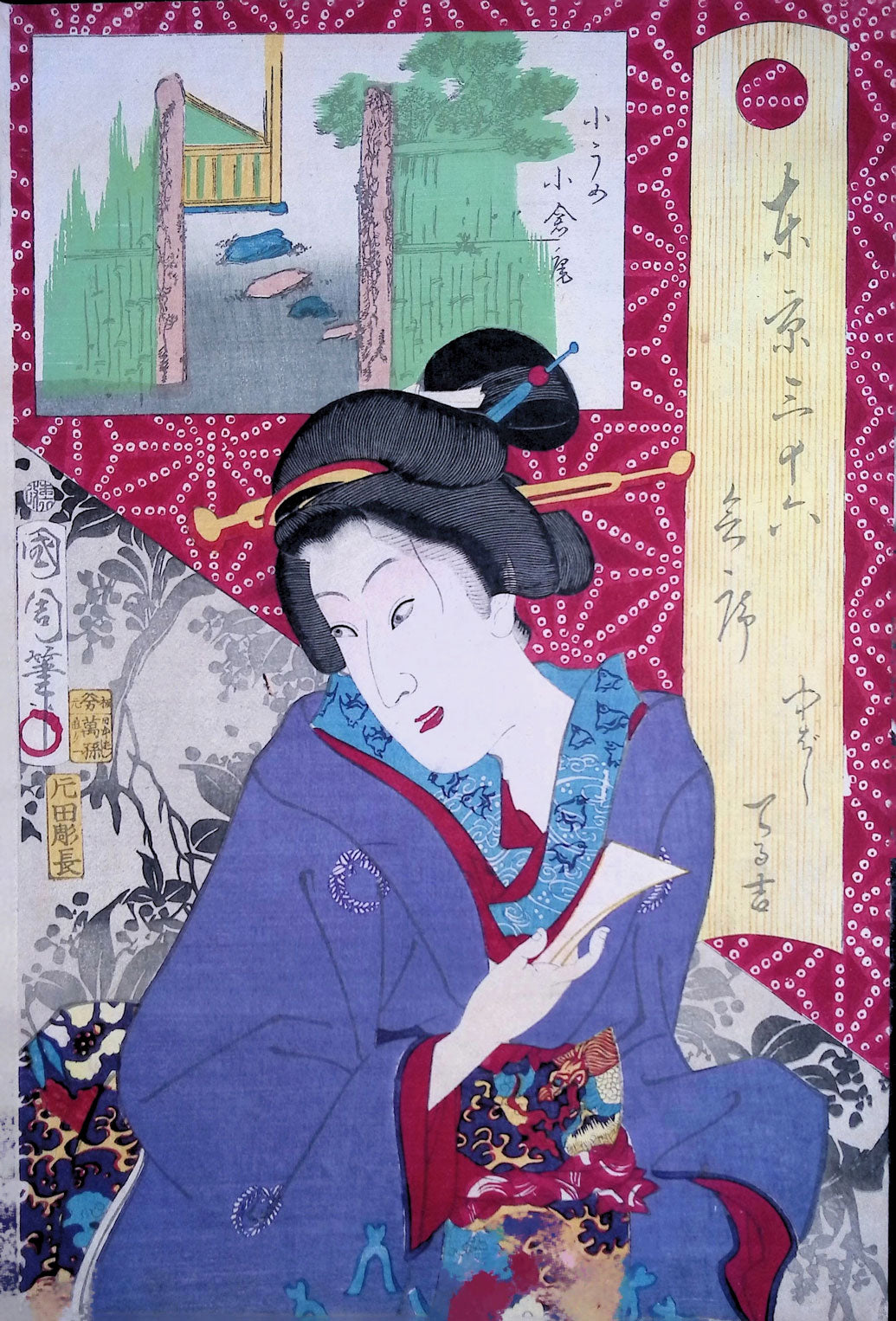 The series "Thirty-six Famous Tokyo Restaurants" by Toyohara Kunichika. This colorful series pairs famous geisha with famous Tokyo eateries. In the series, the rectangular panel at top left shows either speciality dishes or views from the restaurant. The large yellow cartouche on the right shows the series' title, name of the geisha and the restaurant's address. The background is split diagonally with a strong red textile pattern in the top half called "Asa no ha". The Asa no ha pattern is one of the most popular traditional patterns often seen on Japanese kimono. Asa no ha means: Asa = hemp: no = of: ha = leaf. The geometric pattern, represents overlapping hemp leaves.