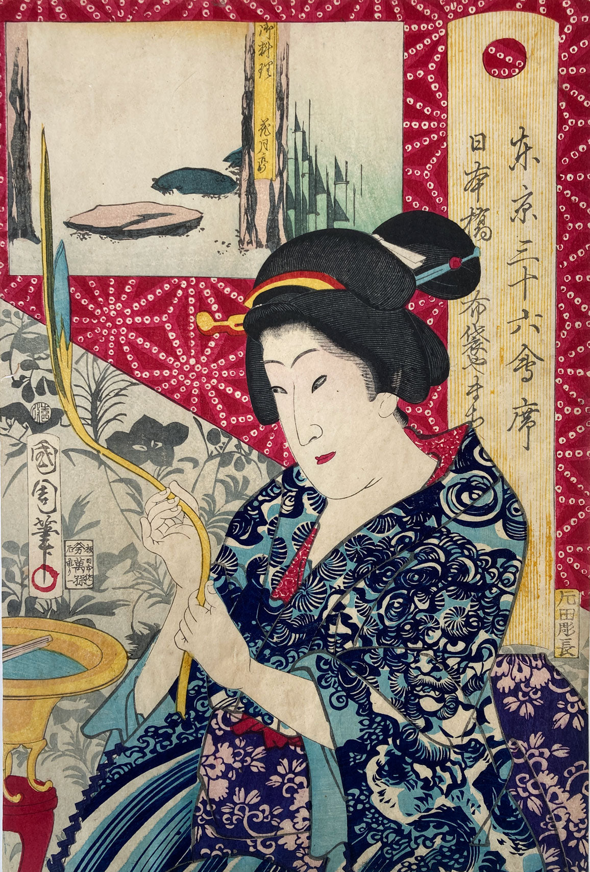 This series borrows heavily from his early series The First Mists of Spring both in design and composition but also in the delicately shaded background of leaves. This series, along with Kunichika's other series "Thirty-Six Famous Modern Restaurants" are wonderfully designed and produced. The complex patterns, dynamic compositions, beautiful portraits of geisha, and interesting scenes are a major reason for the success of this print series.