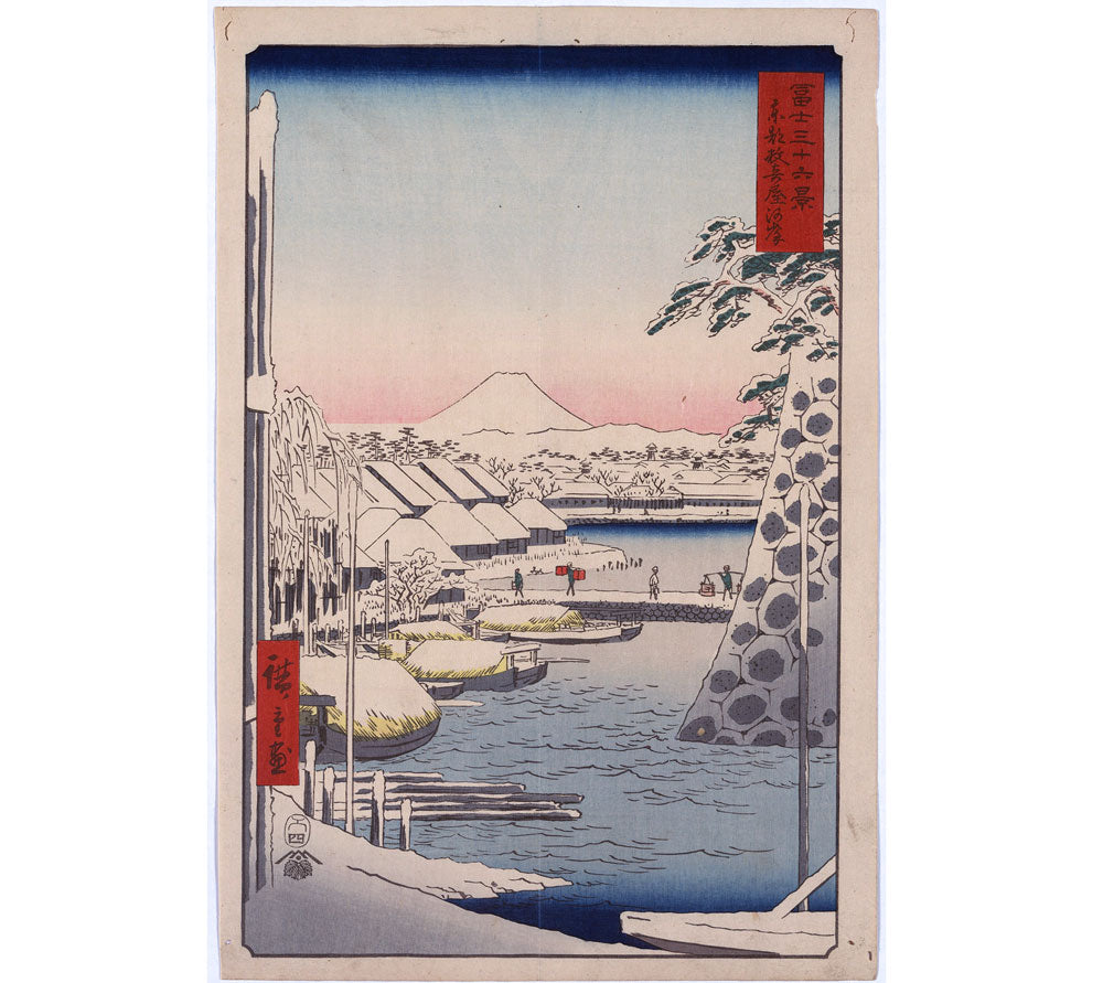 In the last decade of his life, Hiroshige produced 118 prints for the series “One Hundred Famous Views of Edo”. In this series Hiroshige frequently places large-scale objects in the foreground. This device, derived from Western art, adds depth and perspective to the composition.