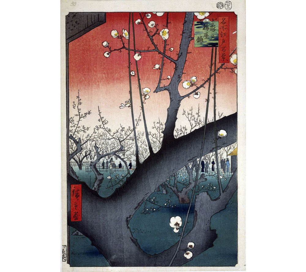 On the right, we see the print "The Plum Garden in Kameido". This series greatly influenced the French Impressionists.