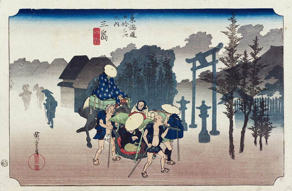 This set of fifty-five prints (including prints for the starting-point at Edo and arrival at Kyoto) was published in 1834. It's also known as the "Hoeido Tokaido"or Great Tokaido. On the left we see the Tokaido station "Mishima"on a misty morning. Sleepy travellers are walking by The torii (gate) of Mishima Taisha shrine in the background. Notice how the mist creates this evocative layered scene.