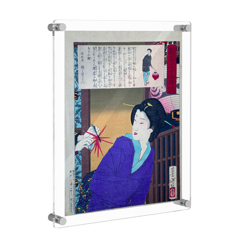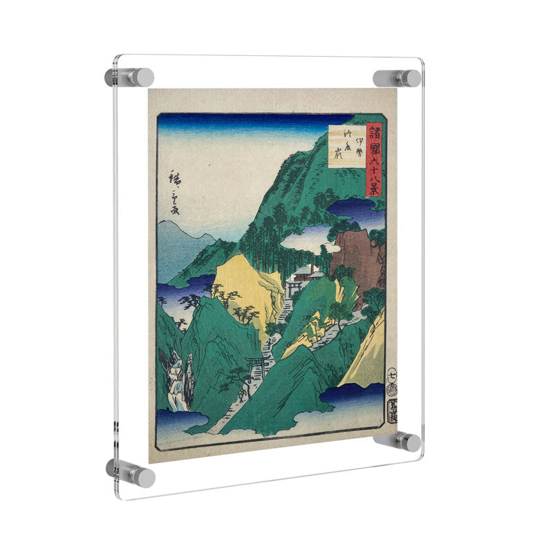 Crafted from 100% super-clear double-panel acrylic, this elegant frame is designed to showcase prints, including ōban-size Japanese woodblock prints (10 × 15 inches / 25 × 38 cm). It can be displayed vertically or horizontally, with a full frame size of 13 × 16 inches.