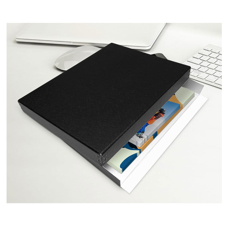 The portfolio’s reversible spine insert allows for clear labeling, making it ideal for organizing prints by artist, series, or collection.