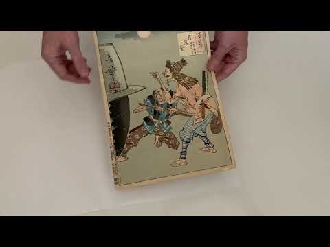 Comic depiction of two bumbling townsmen, Kofuno no Gengo and Koshi Hanzo, trying to steal a huge iron cooking pot. Seemingly unaware of the full moon illuminating their scheme, the pair begins banging and sawing at the pot as if they could break it into smaller, more easily concealed pieces. Yoshitoshi caricatures the figures with wild expressions and with exaggerated poses to emphasize the humor of the situation. An amusing illustration, with skillful carving in printing of the brushstrokes in the sky and the cauldron.