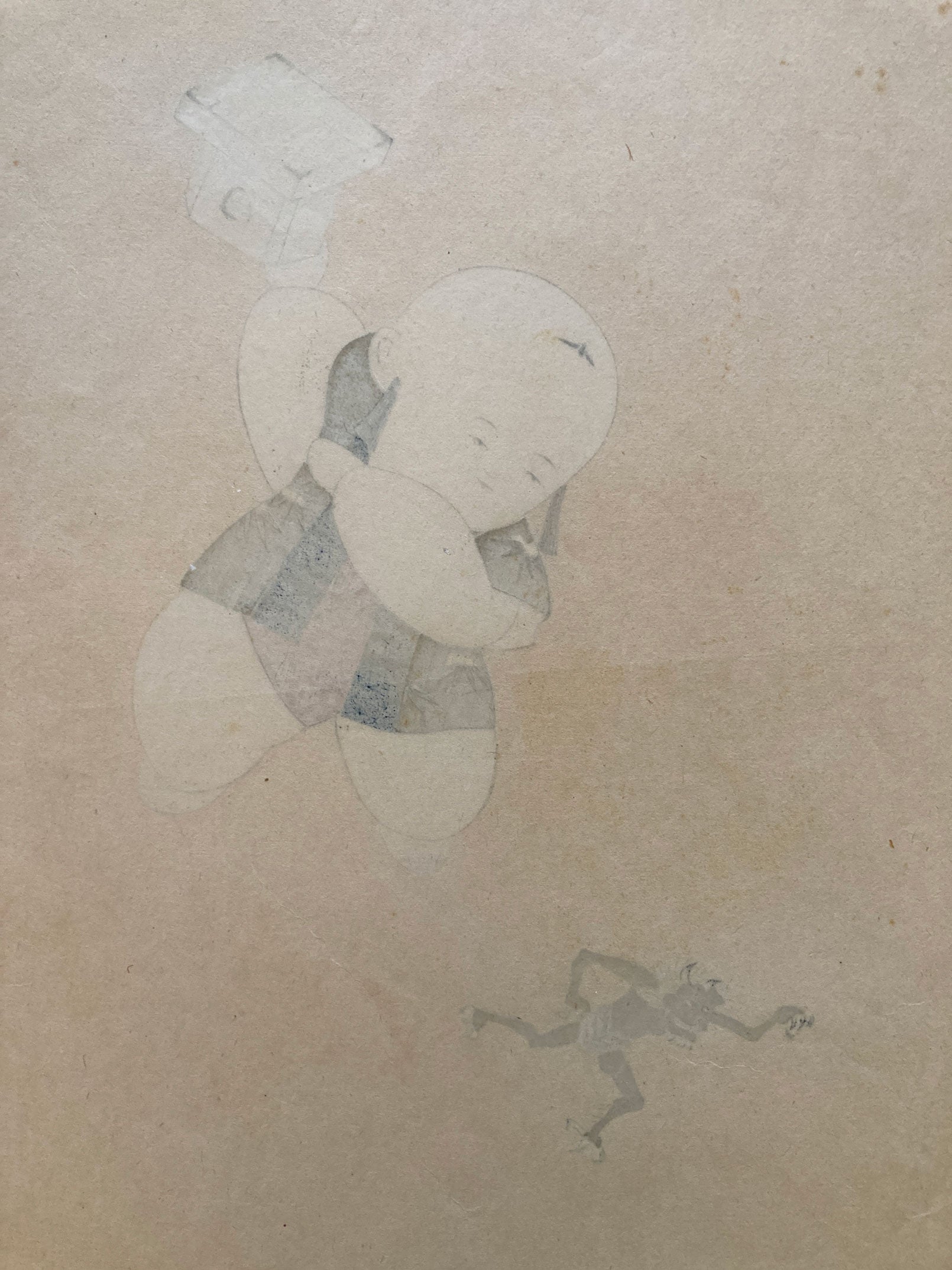 Gosho ningyo, these childlike dolls are characterized by their chubby figures, fair skin, small hands and legs, their large heads, and simple eyes and noses. Nishizawa Tekiho 西沢 笛畝 was the son-in-law and adopted heir of Nishizawa Senko (1864-1914), a writer and collector of dolls and toys, Tekiho studied under Araki Kanpo (1831-1915) and Araki Jippo (1872-1944), a father-and son pair of Nihonga painters who specialized in bird-and-flower painting. He was most famous for his charming paintings of traditional dolls and, following in his adoptive father's footsteps, he became a serious collector of dolls.