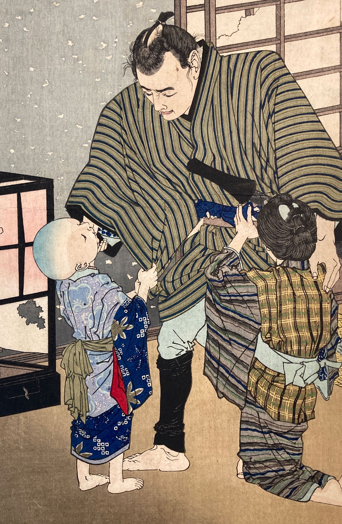 This diptych by Yoshitoshi shows the scene of a tragic story. Called Sakura Sogo no hanashi, or the The Story of Sakura Sogo, It’s based on a Japanese farmer named Sogoro. In his area in the year 1653 the ruler was a man named Masanobu and he was imposing a huge tax on the farmers so they could barely live. Sogo decided to go directly to the Shogun and complain. His complaint worked and the taxes on the farmers were reduced but what he did was illegal and Masanobu was said to have crucified Sogo and his wife and beheaded their children. In this print Sôgo visits his family for the last time and his children cling to him and try to stop him from leaving. You can see the great detail in the kimonos.