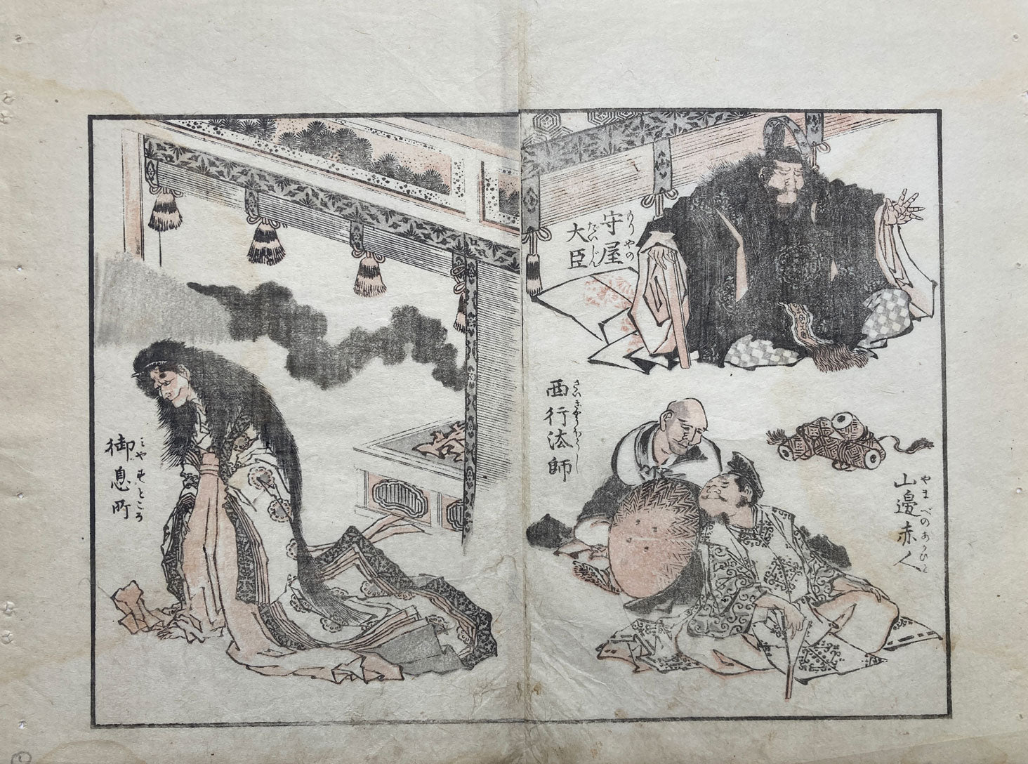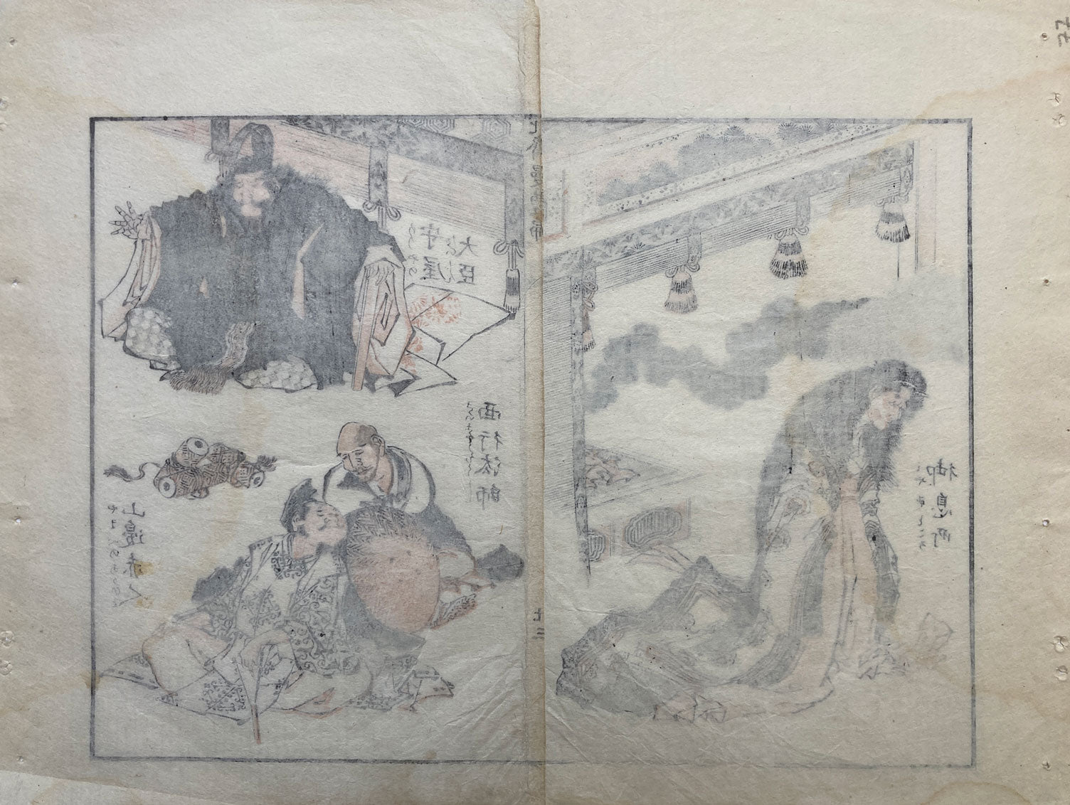 Two pages from Hokusai manga, vol.5 (伝神開手)北斎漫画, 五編 (Transmitted from the Gods) Random Drawings by Hokusai, with illustrations in three colours (black sumi, light black sumi, and light vermilion) and text. Representations of people, plants and animals, fish, birds, mythological figures, landscapes, etc.