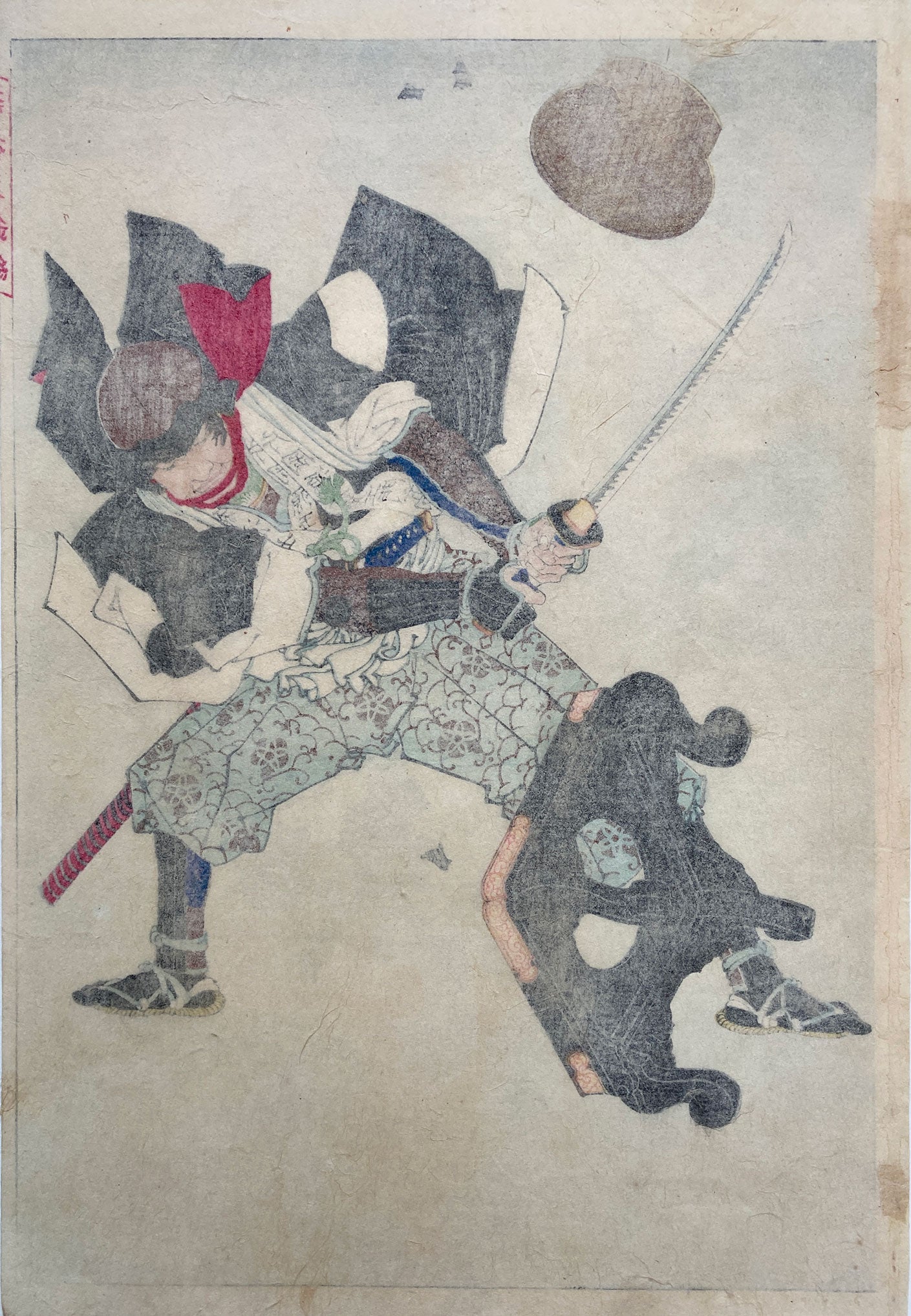 (Gishi Youchi no zu). From the series “New Selection of Eastern Brocade Pictures”, A man throws a brazier of hot coals at a sword-wielding assailant, the ashes scattering in a dust cloud. The samurai is one of the 47 Ronin, during their famous night attack.