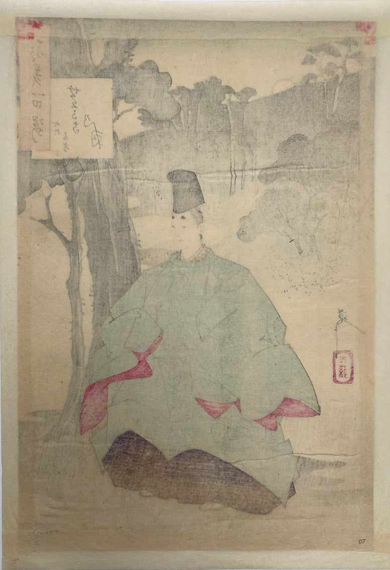 Fujiwara no Yoshitaka held the rank of 'shōshō', (‘minor captain’), at the 10th-century Heian court. As a 12 year old, he garnered attention at poetry parties at the palace for his skills in composing linked verses. To avoid conflict with his older brother, Agechika, who was likewise an accomplished poet, Yoshitaka eventually gave up poetry to concentrate on Buddhist studies. Dressed in courtly attire, he is shown here sitting deep in thought in an extensive garden ground on a moonlit night. Even though no characteristic landmarks are in sight, the print’s title identifies the location as the ground of Seson temple outside of Kyoto.