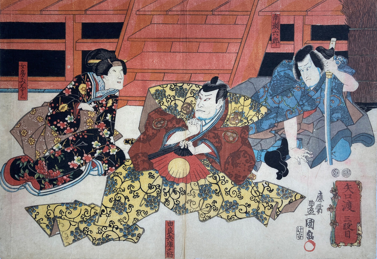 Diptych. Actors Ichikawa Kuzô II as Minase Rokurô, Nakamura Utaemon IV as Yura Hyôgonosuke, and Onoe Kikujirô II as Wife (Nyôbô) Minato, in Act III (Sandanme) of the Play Yaguchi Watari.