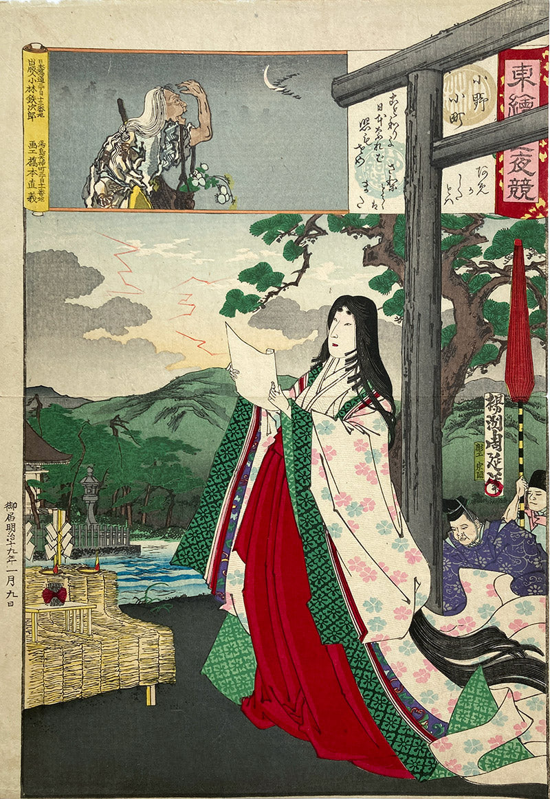 "Azuma Nishiki Chuya Kurabe" (Edo Embroidery Pictures, Comparison of the Day and the Night). The famous poetess Ono no Komachi is reading her poem to the sky and asking for the rain to fall. Soon after, the rain started. The Heian period poet stands before a Shinto alter holding a manuscript, the cartouche with Ono no Komachi as an old woman peering at a crescent moon.