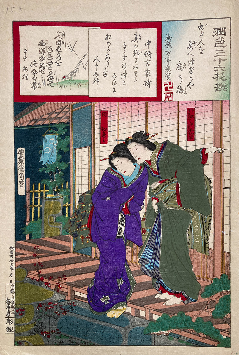 An unusual Kunichika series designed in 1881. Each print pairs a poem by one of the Thirty-six Immortal Poets with well-known contemporary beauties, the "enchanting flowers" of the series title, involved in daily activities. These woodblocks offer a charming look at Meiji era life.