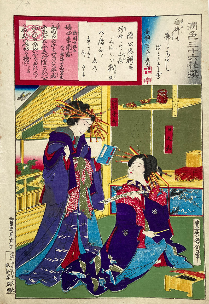 An unusual Kunichika series designed in 1881. Each print pairs a poem by one of the Thirty-six Immortal Poets with well-known contemporary beauties, the "enchanting flowers" of the series title, involved in daily activities. These woodblocks offer a charming look at Meiji era life.