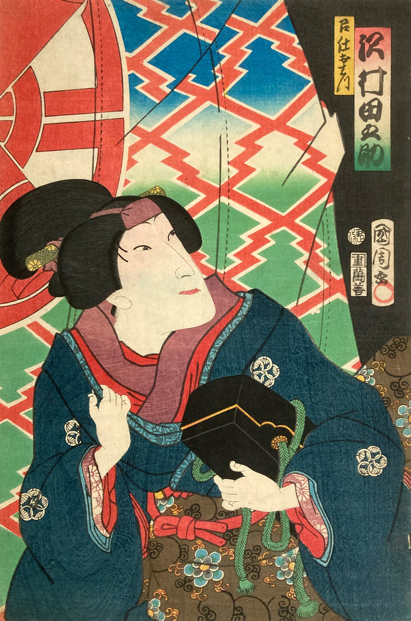 Dynamic design for a kabuki scene. Actor Sawamura Tanosuke III as Meshitsukai Ohatsu 「召使おはつ 沢村田之助」(三代目)