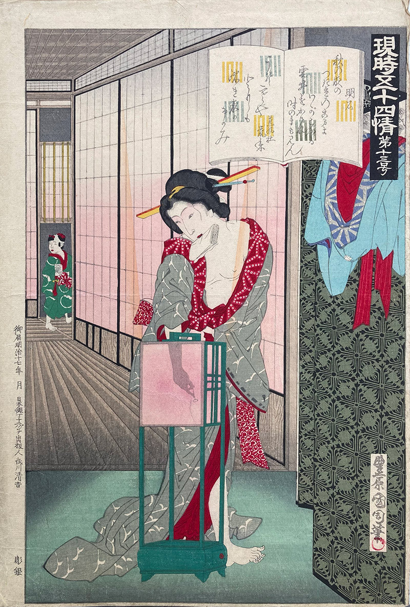 Beautiful print from the series Fifty-four Modern Feelings - based on the 1828 novel "A False Murasaki's Country Genji," a parody of the famous "Tale of Genji." Chapter 13. "Akashi". Kunichika has illustrated the chapters of the story with updated, modern beauties dressed in the contemporary fashions of the day.