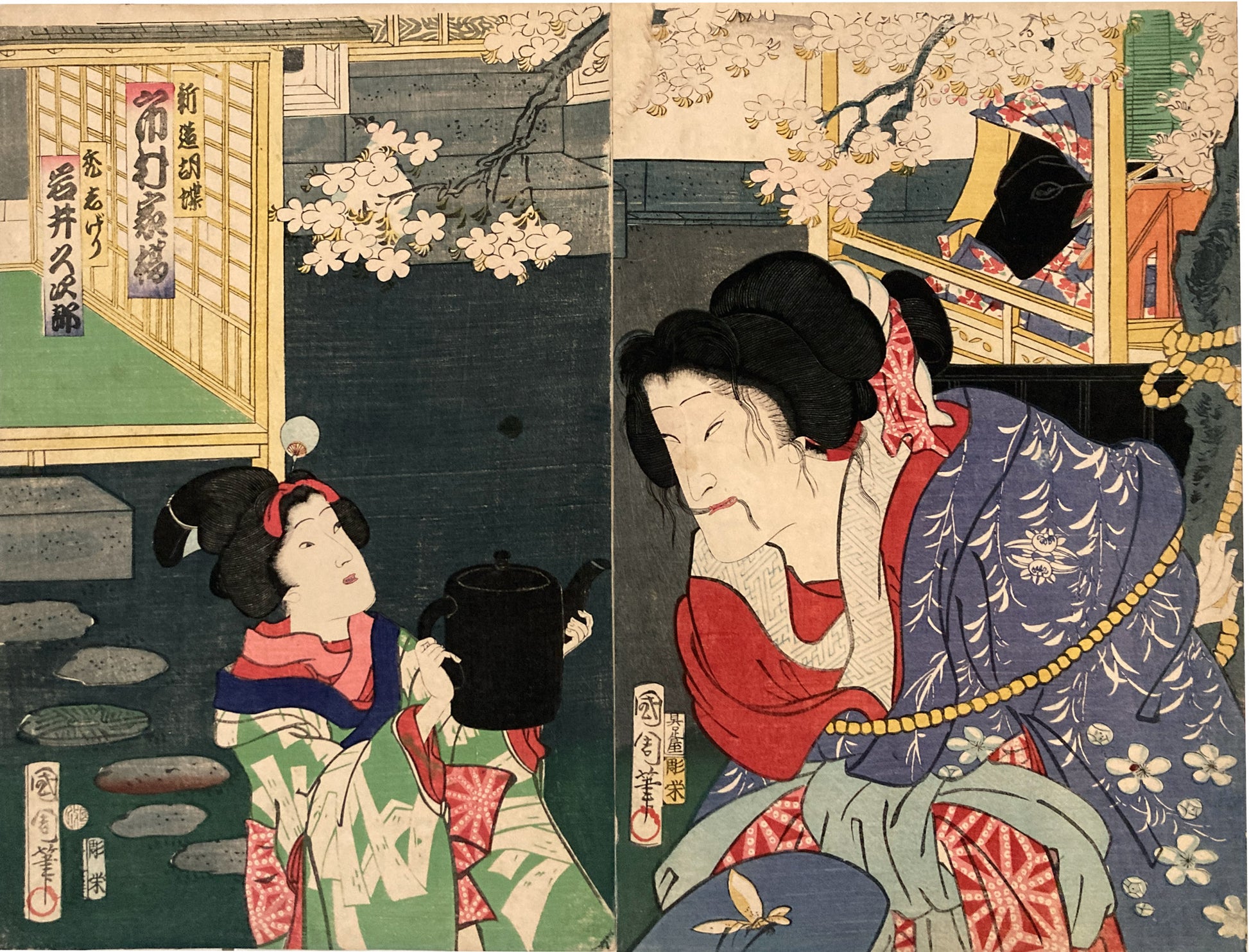 These two sheets portray the actors Ichimura Kakitsu V as the ‘shinzō’ (junior courtesan) Kochō (in reality, the spirit of a cat), and Iwai Kyūshirō as the ‘kamuro’ (a courtesan’s child apprentice) Shigeri.