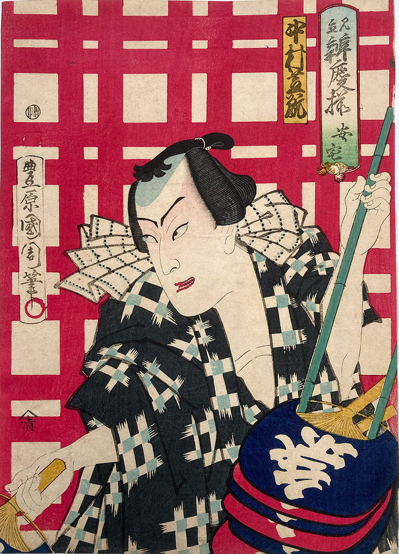 Benkei Fashions Parodied, is a commentary on popular fashions among trendy Edo young men or street toughs. The prints also reference the legend of Benkei through the the checked material backgrounds. Benkei was a samurai monk from the middle ages who became popular with young men of the mid-nineteenth century. These youths adopted a dress of broad checked cloth called Benkei-jima. The actor playing the role is Nakamura Shikan.