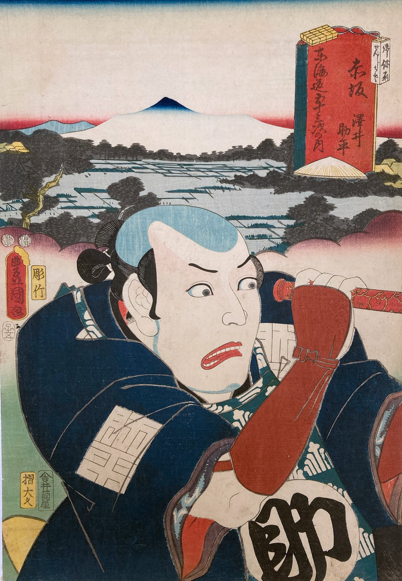 Toyokuni III's 1852 series "The Fifty-three Stations of the Tokaido" pairs kabuki portraits with the stations along the famous Tokaido Road. Each design features a half-length figure in the foreground, with a border of clouds separating the actor from the landscape above. Interestingly, the title cartouche of each print is framed by different objects related to the kabuki character or play, including armor and weapons, household objects, flowers, horse equipment, and traveler's clothing and baggage. The large expressive characters are beautifully drawn and detailed, with fine line work in the hair and soft bokashi shading in the backgrounds. (length 36.9 cm × width 25.8 cm).