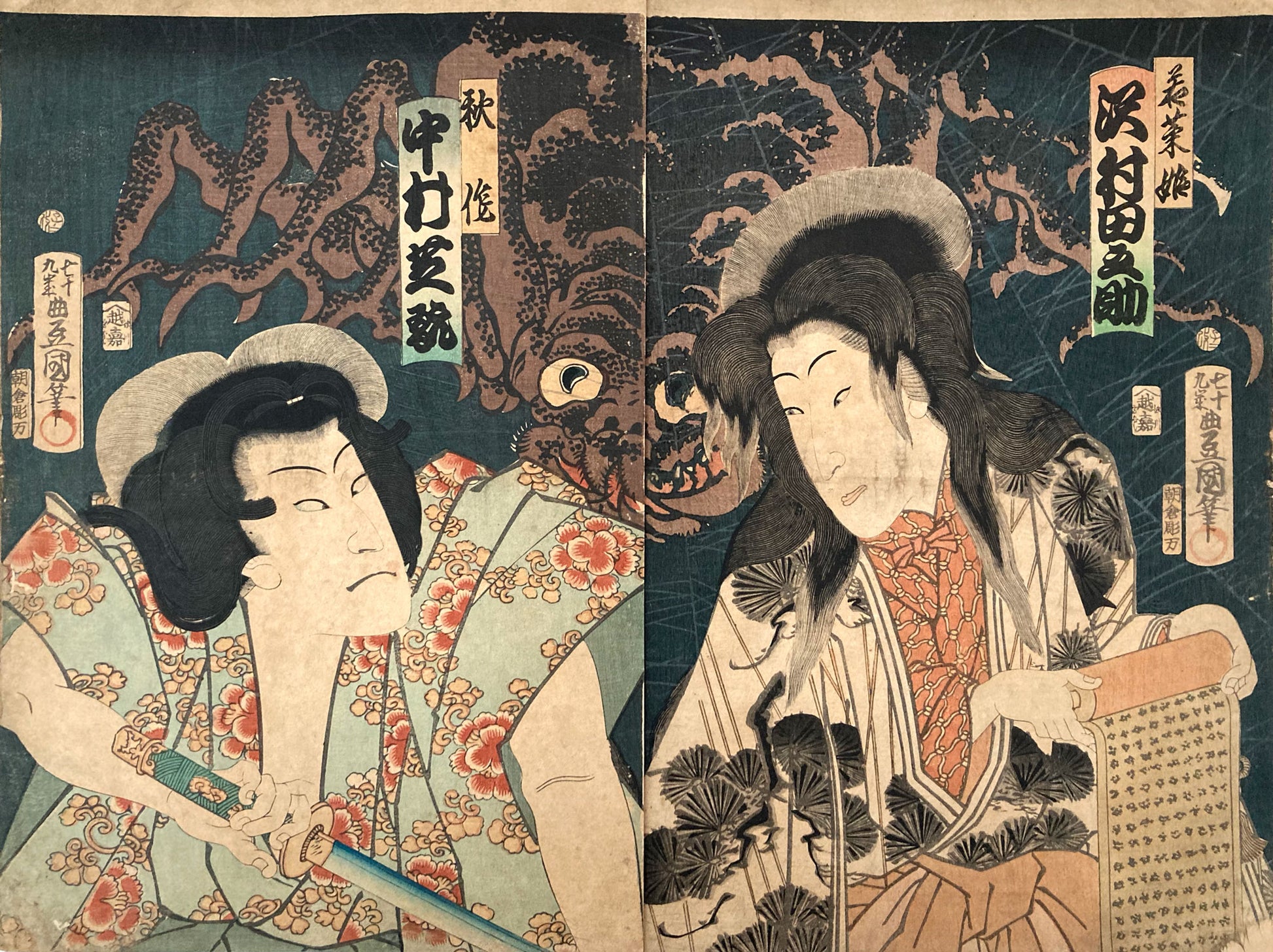 An oban tate-e diptych of the kabuki play Shiranui monogatari (The Tale of Shiranui), depicting Princess Wakana using the magic of the spider scroll to conjure a giant spider to assist her in her fight with her enemy. Staged at the Morita-za Theatre in the 2nd month of 1864. 甲子曽我大国柱」若菜姫/沢村田之助 他 二枚続 裏打