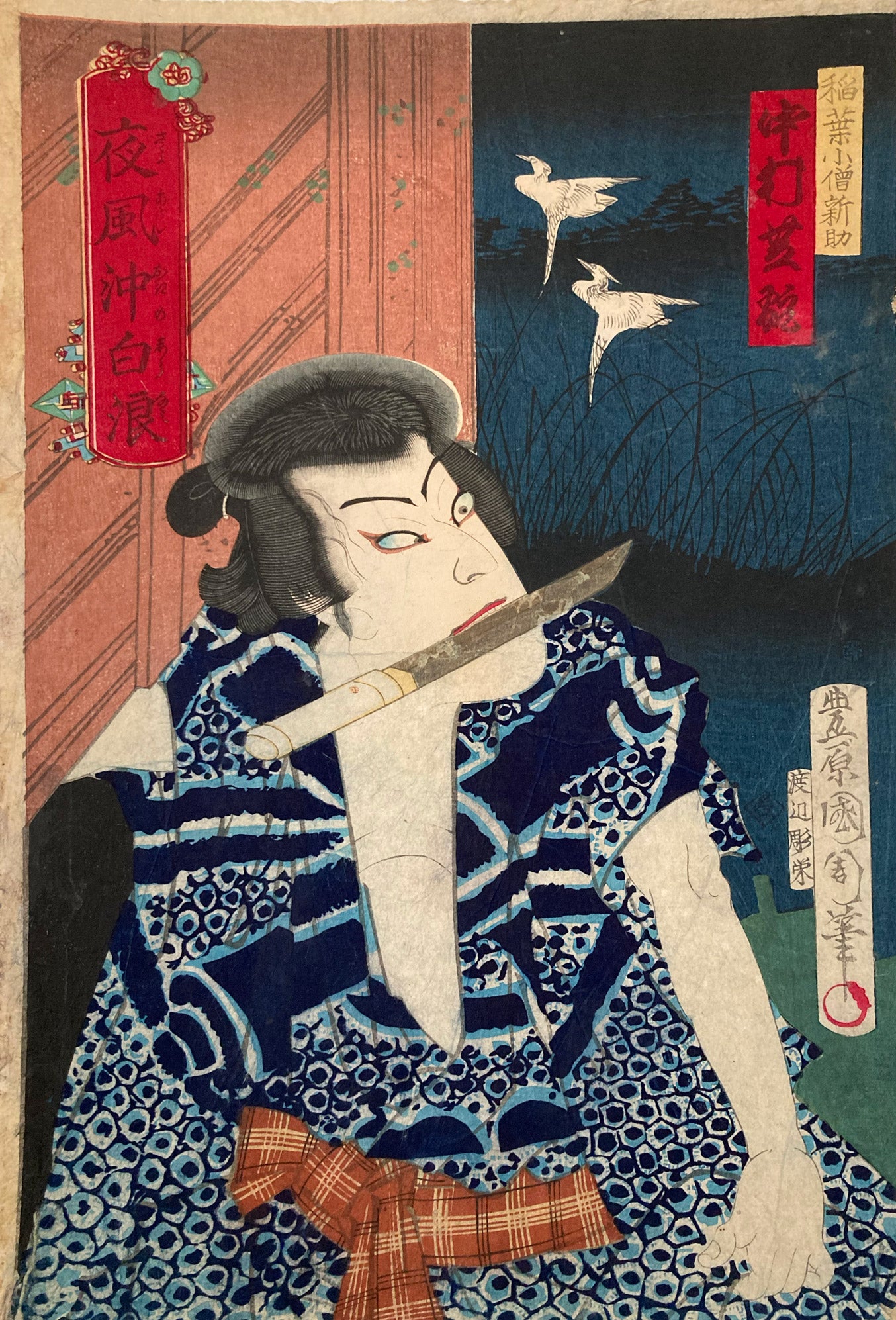 From a series of 6 actor prints. Night Kazeoki Shiranami (night breeze offshore white waves). Bandit in a wonderful blue kimono holds a knife in his teeth. 豊原国周「夜風沖白浪」稲葉小僧新助