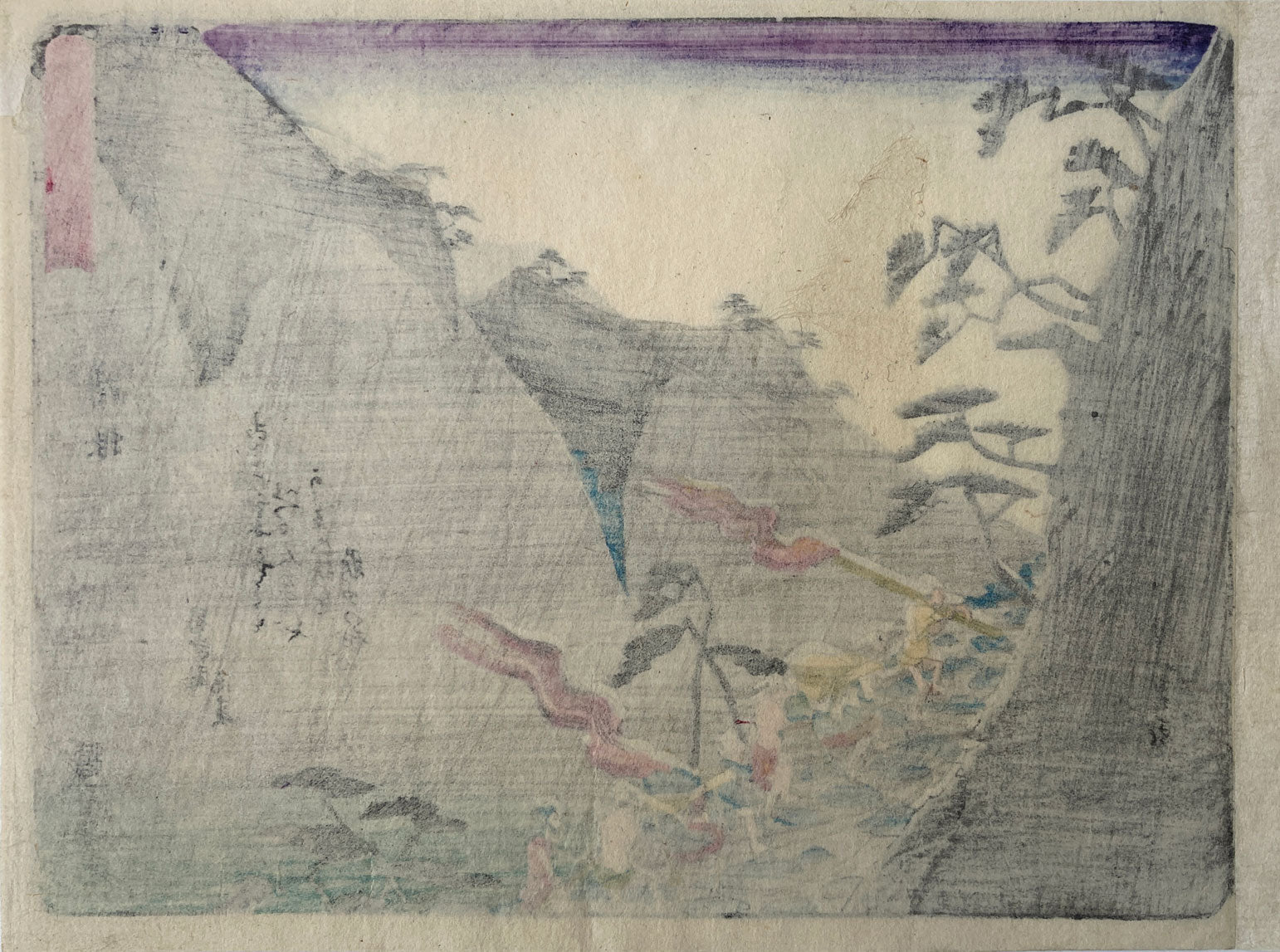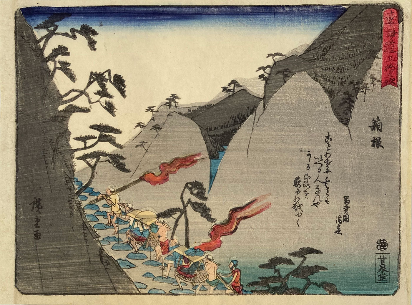 The palanquin carriers holding torches are climbing the steep mountain road in Hakone pass. From "Tokaido Goju-san Tsugi" 東海道五十三次 ("Fifty-three Stations of Tokaido"), Each print in this series has a short comic poem (in Japanese: "kyoka"). Hence this series is known as the Kyoka Tokaido.