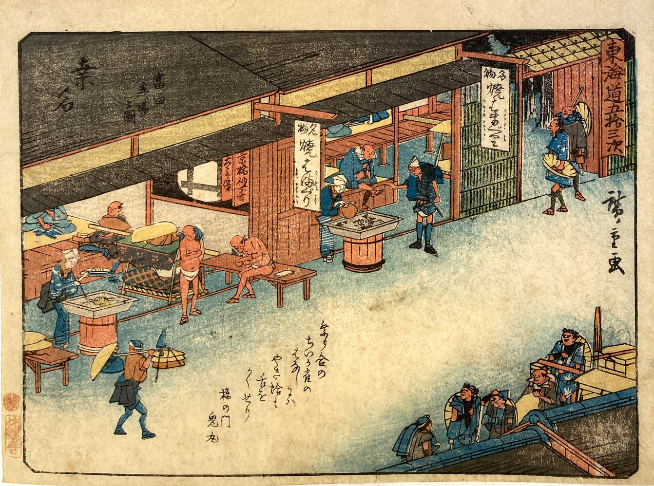 Fifty-three Stations of Tokaido - #43. From "Tokaido Goju-san Tsugi" 東海道五十三次 ("Fifty-three Stations of Tokaido"), Each print in this series has a short comic poem (in Japanese: "kyoka"). Hence this series is known as the Kyoka Tokaido.