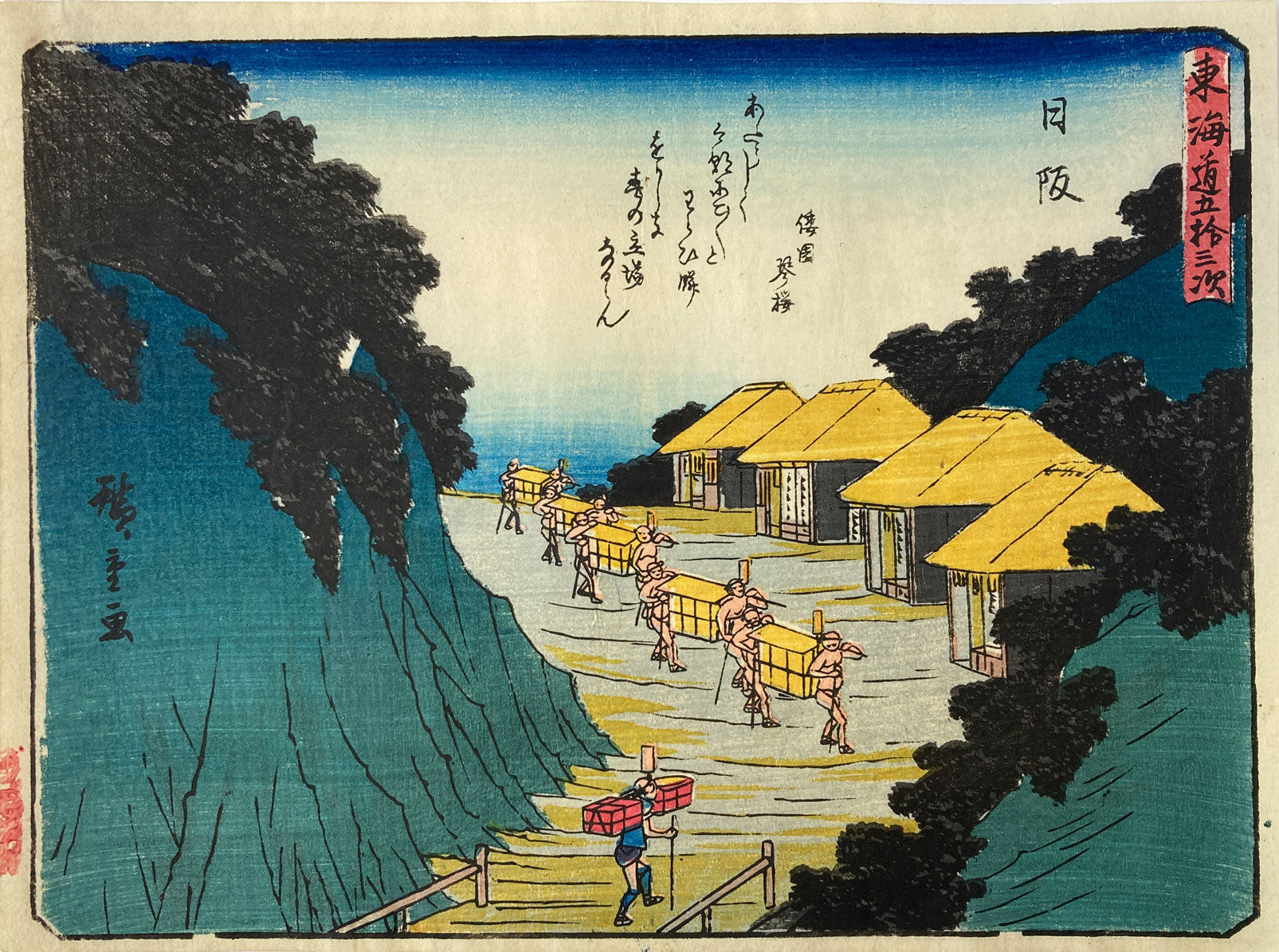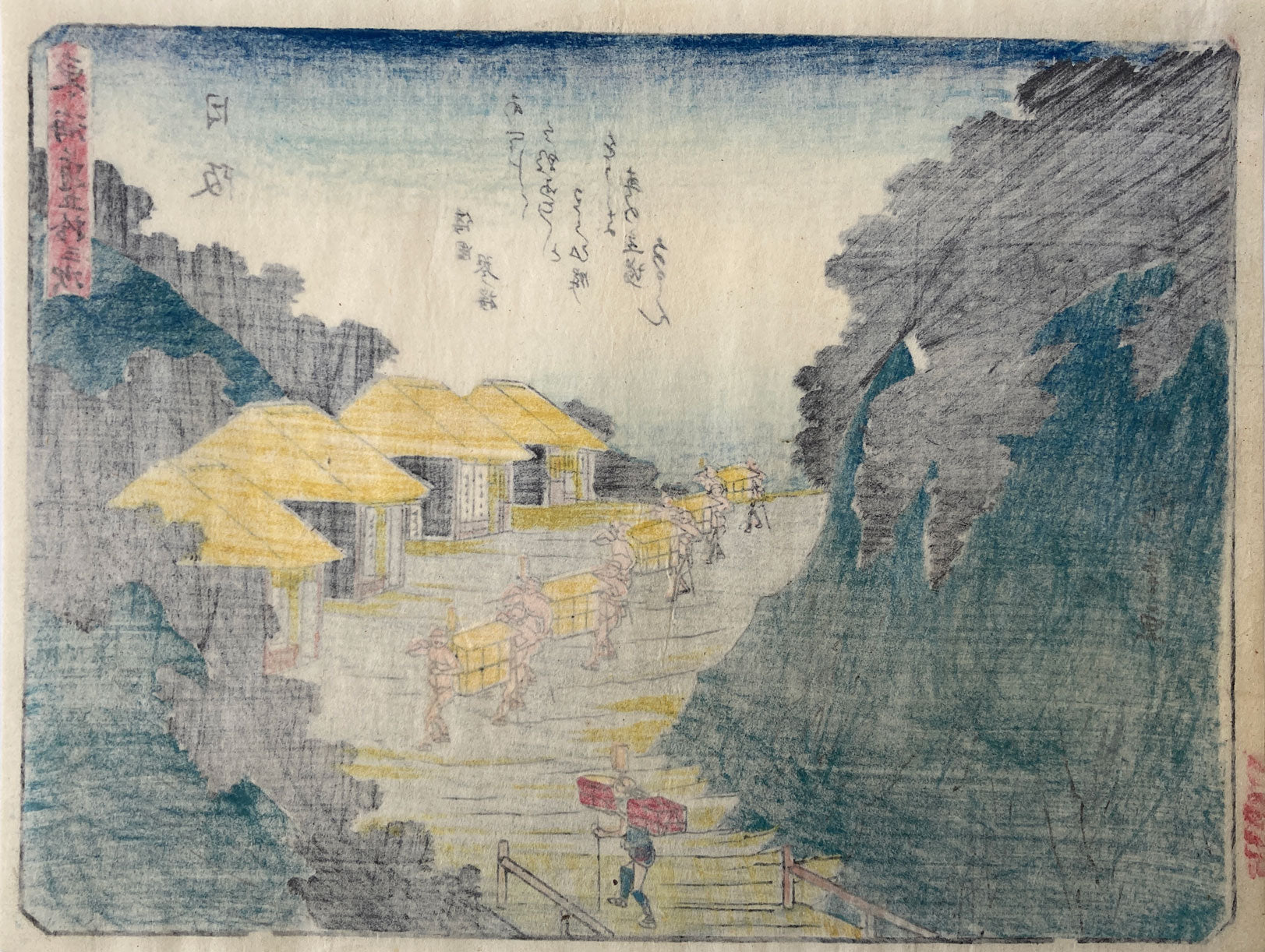 Station number 26 from the "Tokaido Goju-san Tsugi" 東海道五十三次 ("Fifty-three Stations of Tokaido"), Each print in this series has a short comic poem (in Japanese: "kyoka"). Hence this series is known as the Kyoka Tokaido - also known as the Sanoki Tokaido after the publisher.