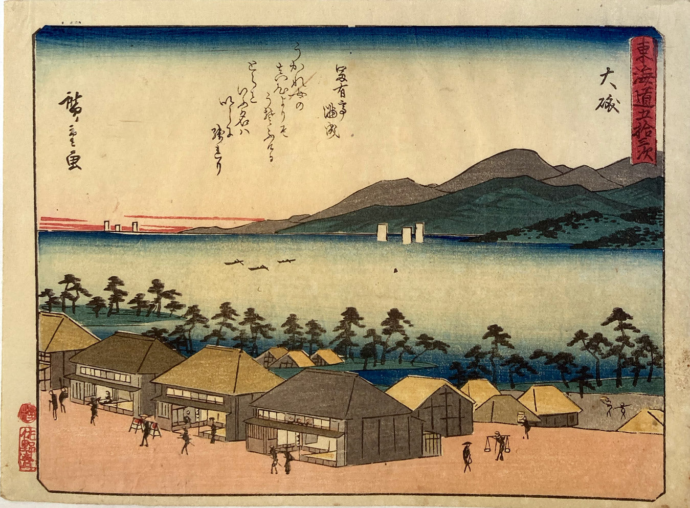 Station number nine from the "Tokaido Goju-san Tsugi" 東海道五十三次 ("Fifty-three Stations of Tokaido"), Each print in this series has a short comic poem (in Japanese: "kyoka"). Hence this series is known as the Kyoka Tokaido - also known as the Sanoki Tokaido after the publisher.