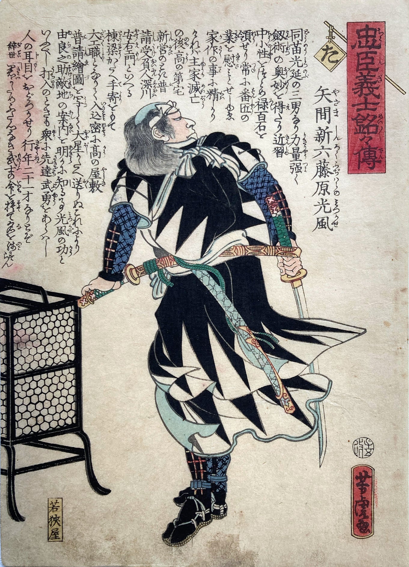 Hazama Shinrokuro Mitsukaze (間新六郎光風) one of the faithful samurai of Asano Naganori (浅野長矩), was a courageous and skilled fighter, a determined and absolutely prepared loyal man. Here we see him depicted, during the legendary assault of the forty-seven ronin (四十七士) on the residence of Kira Yoshinaka (吉良義央).