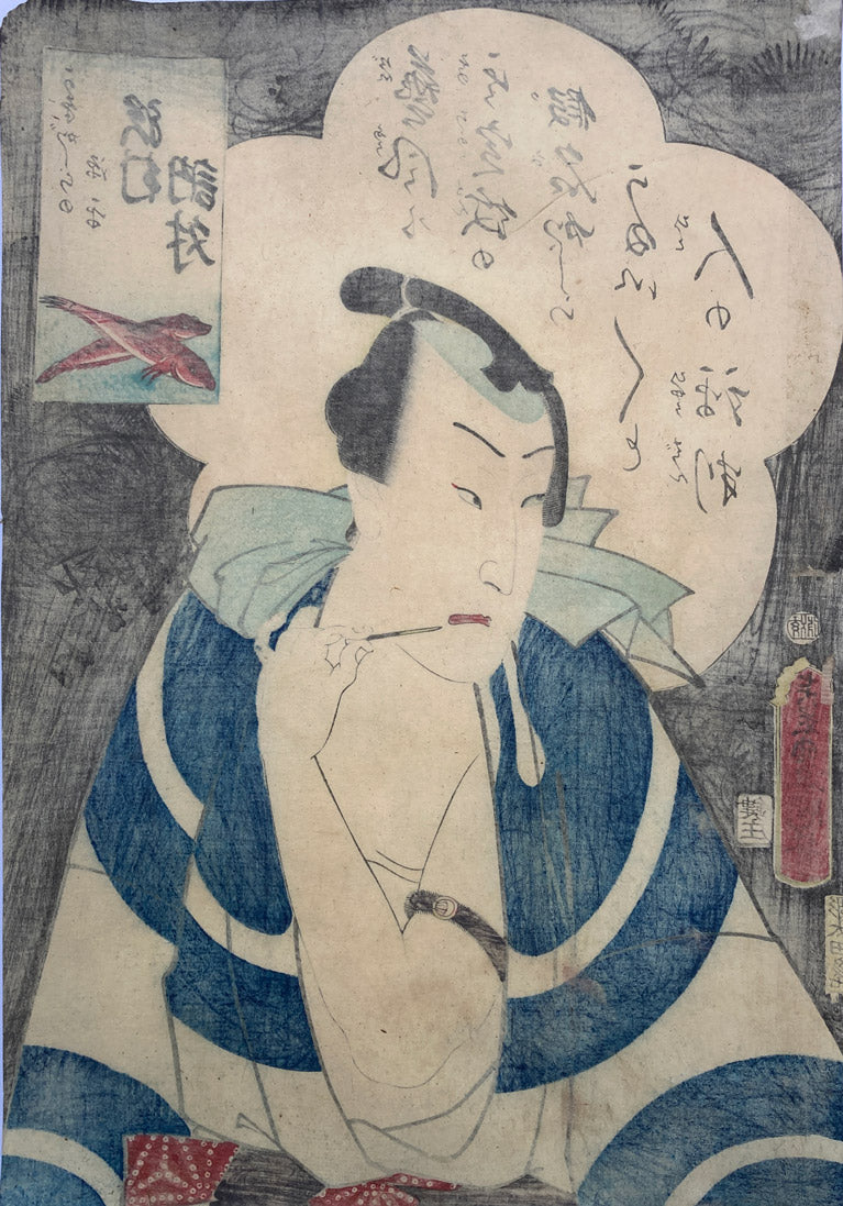 A half-length, untitled set of actor portraits with fish in inset. The actor is wearing a trendy amulet on his arm. Some mica treatment on the background.