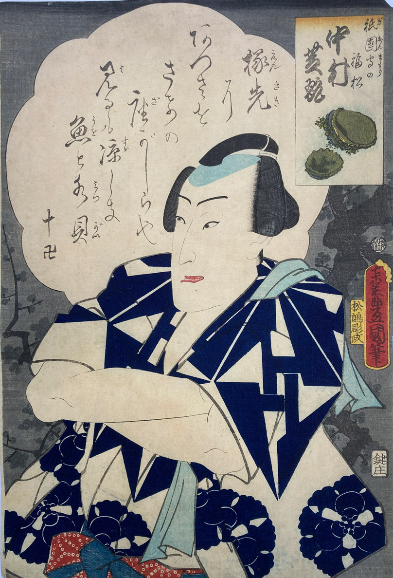 A half-length, untitled set of actor portraits with fish in inset designed by Kunisada. Bold, blue kimono design.