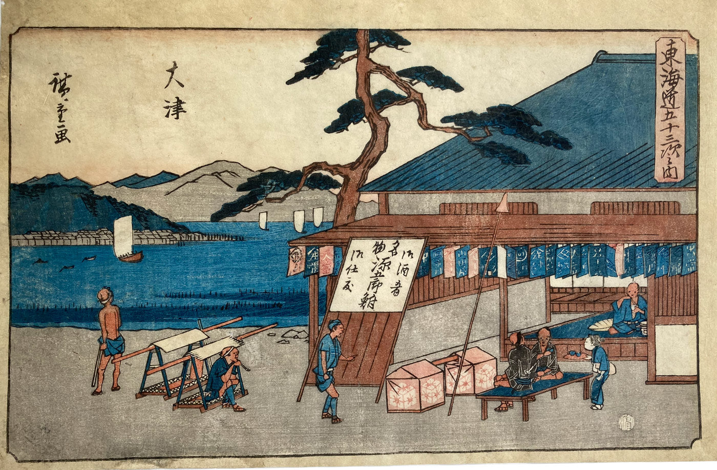 This Tokaido series is also known as "Gyosho Tokaido" for its cursive calligraphy of the title. Ôtsu, from the series The Fifty-three Stations of the Tôkaidô Road (Tôkaidô gojûsan tsugi no uchi).