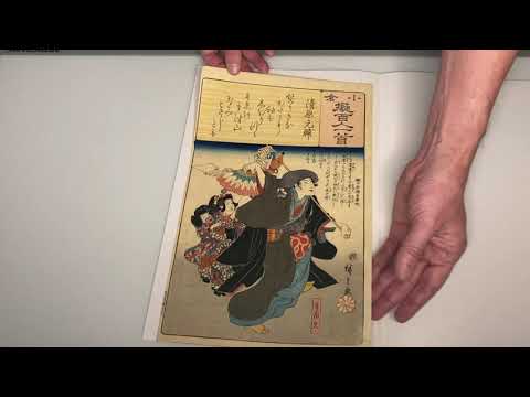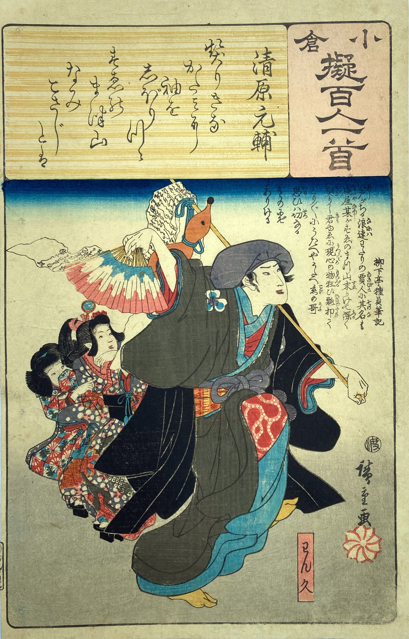 From the series Ogura Imitations of One Hundred Poems by One Hundred Poets (Ogura nazorae hyakunin isshu). This series comprises of 35 prints by Hiroshige, 51 by Kuniyoshi and 14 by Kunisada. In this scene, Wankyū, a playboy of an Ōsaka merchant family is half-mad from desire for Matsuyama.